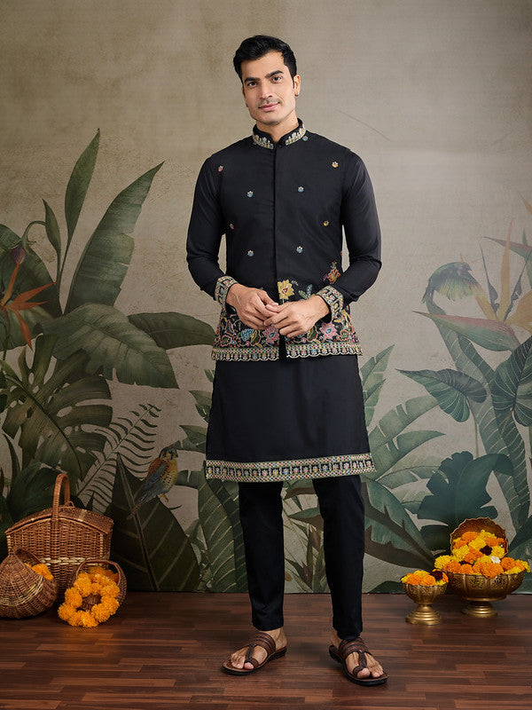 Black Jodhpuri Designer Kurta Set With Multi Coloured Thread Embroidery Work Jacket