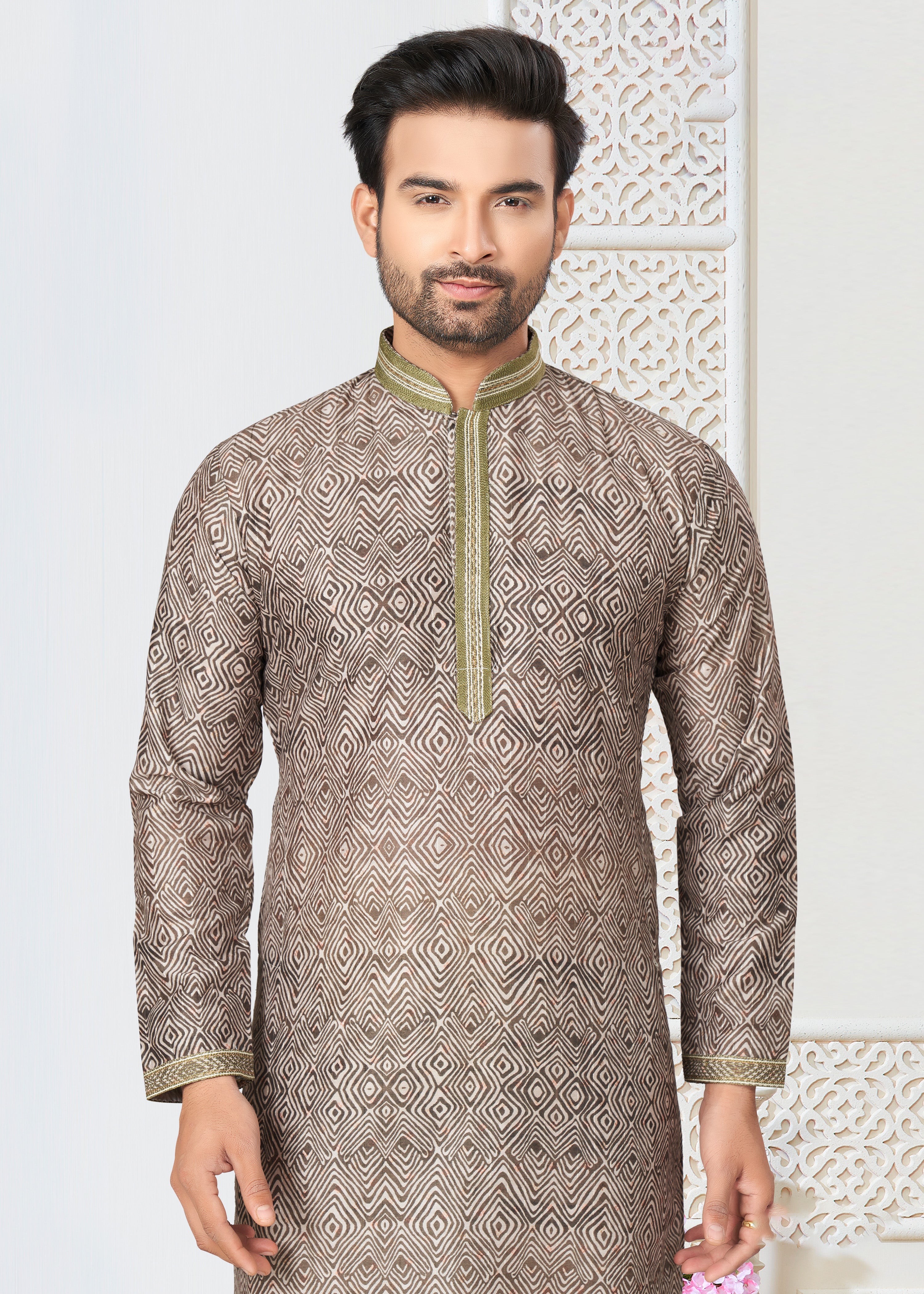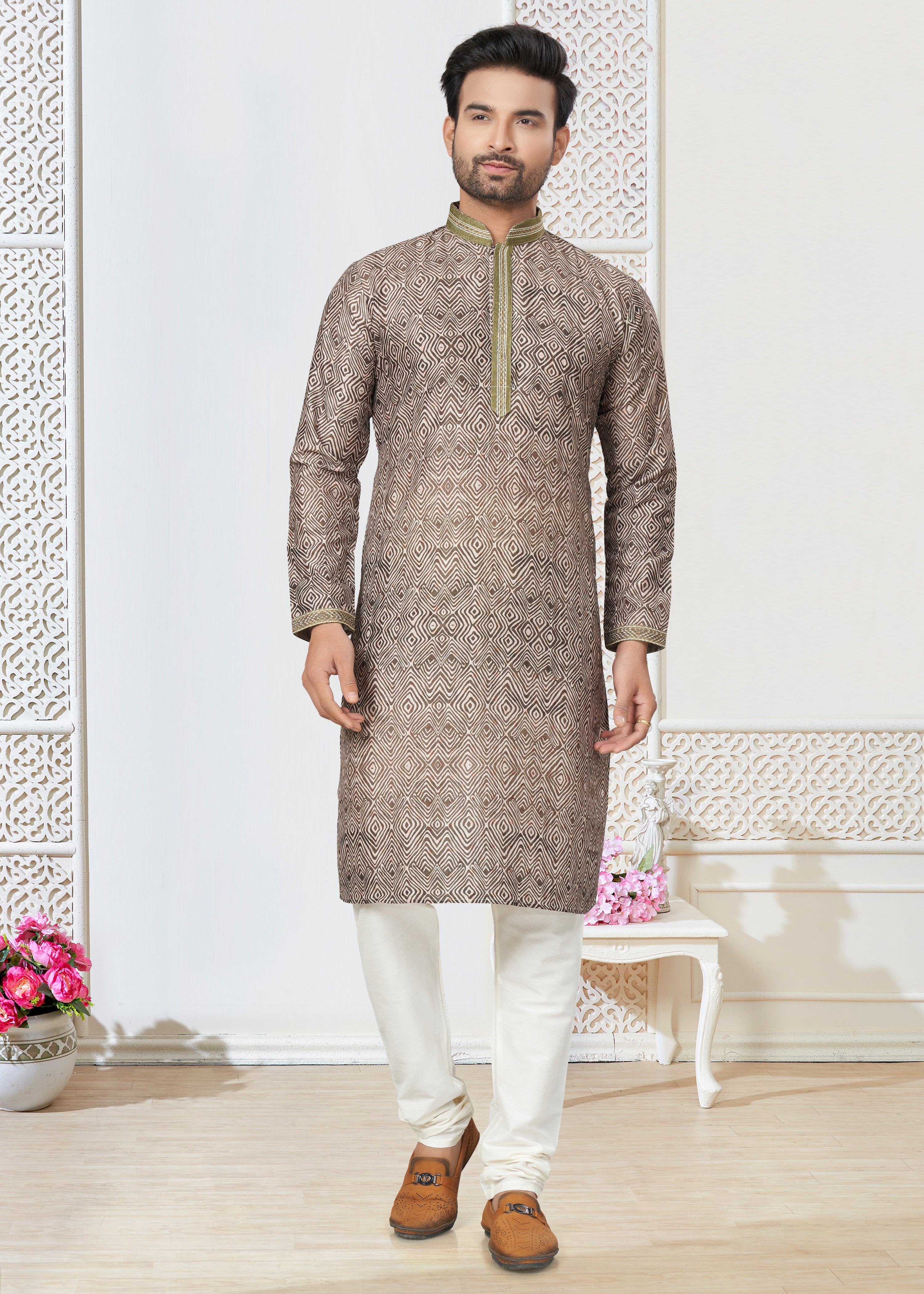 Contrasting indian aspiring Printed khakhi on  jacquard silk Mens kurta for wedding and other occasion comes with pajama