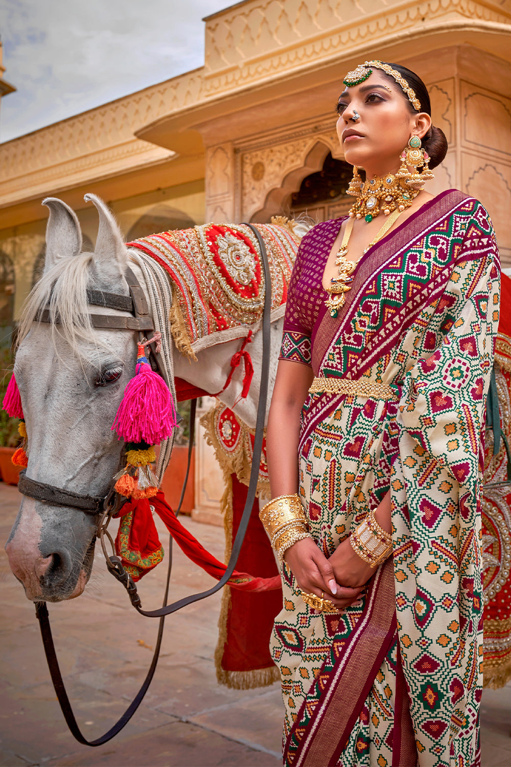 This handwoven patola silk saree has unique patterns and embodies elegance, tradition, as well as comfort.
