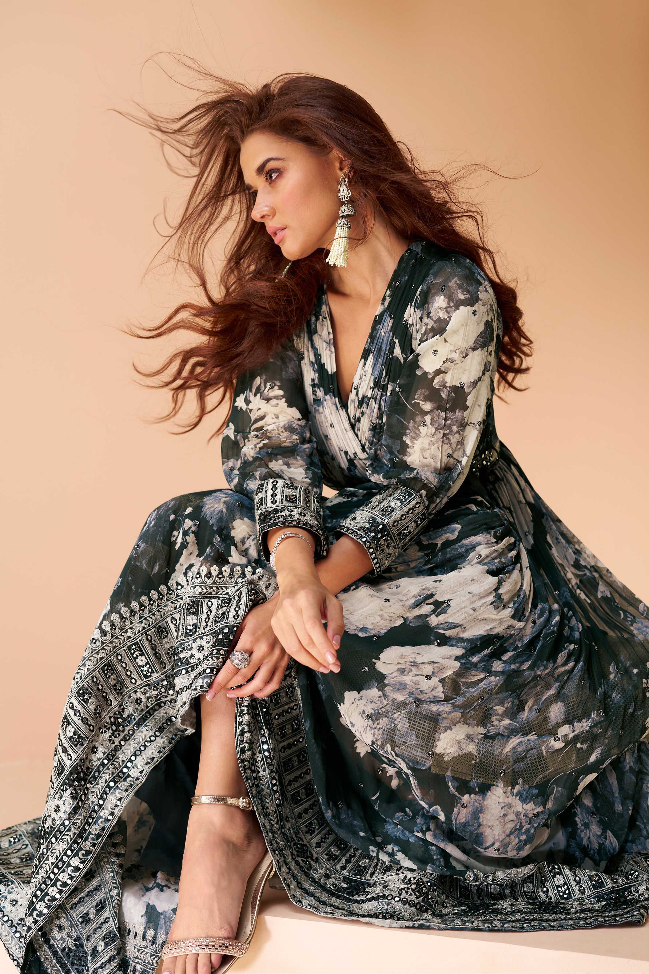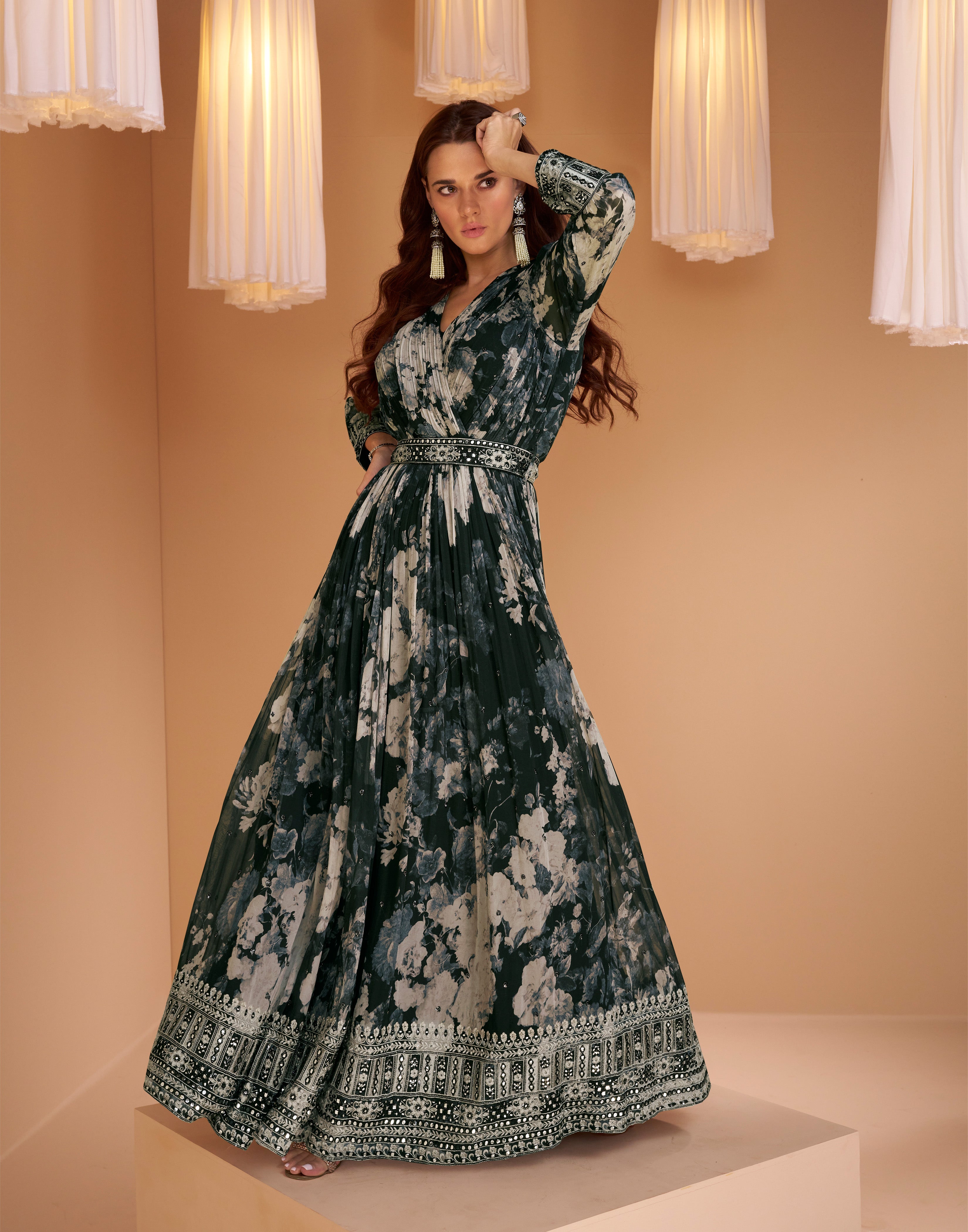 designer anarakali style dark shaded floral inspired dress on pure georgette and net duppatta | designer dress