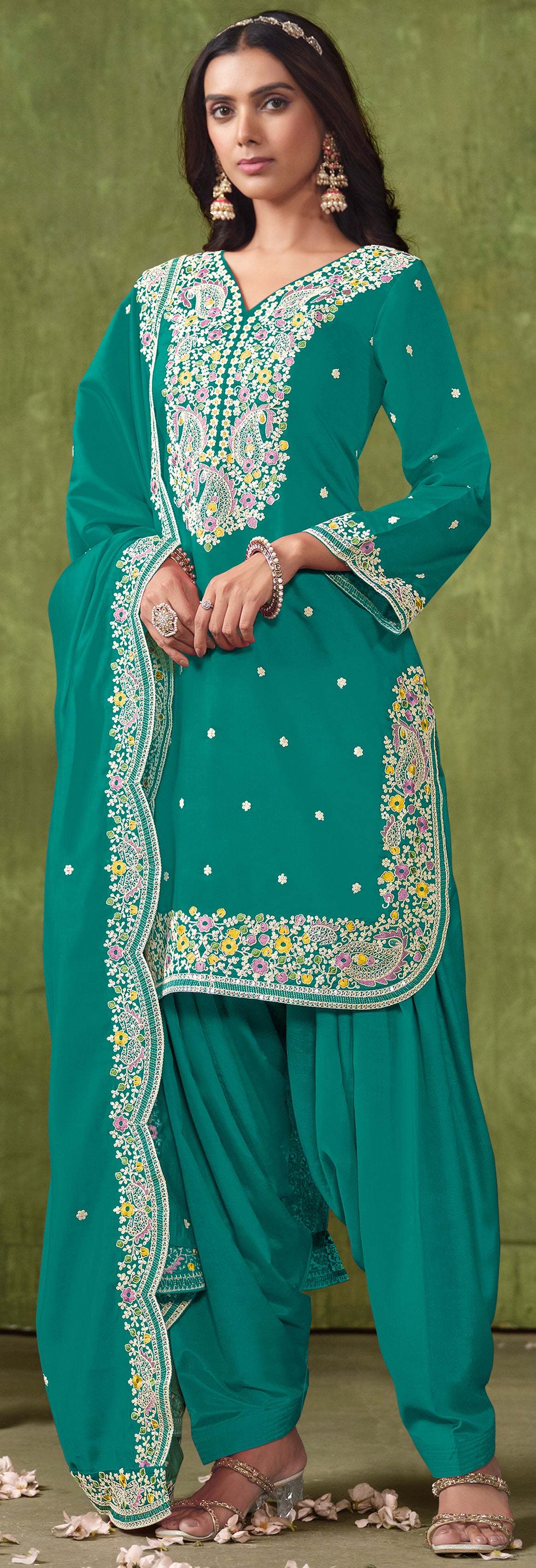 Designer Rama Green pure silk Patiala Suits with deatiled embroidery work