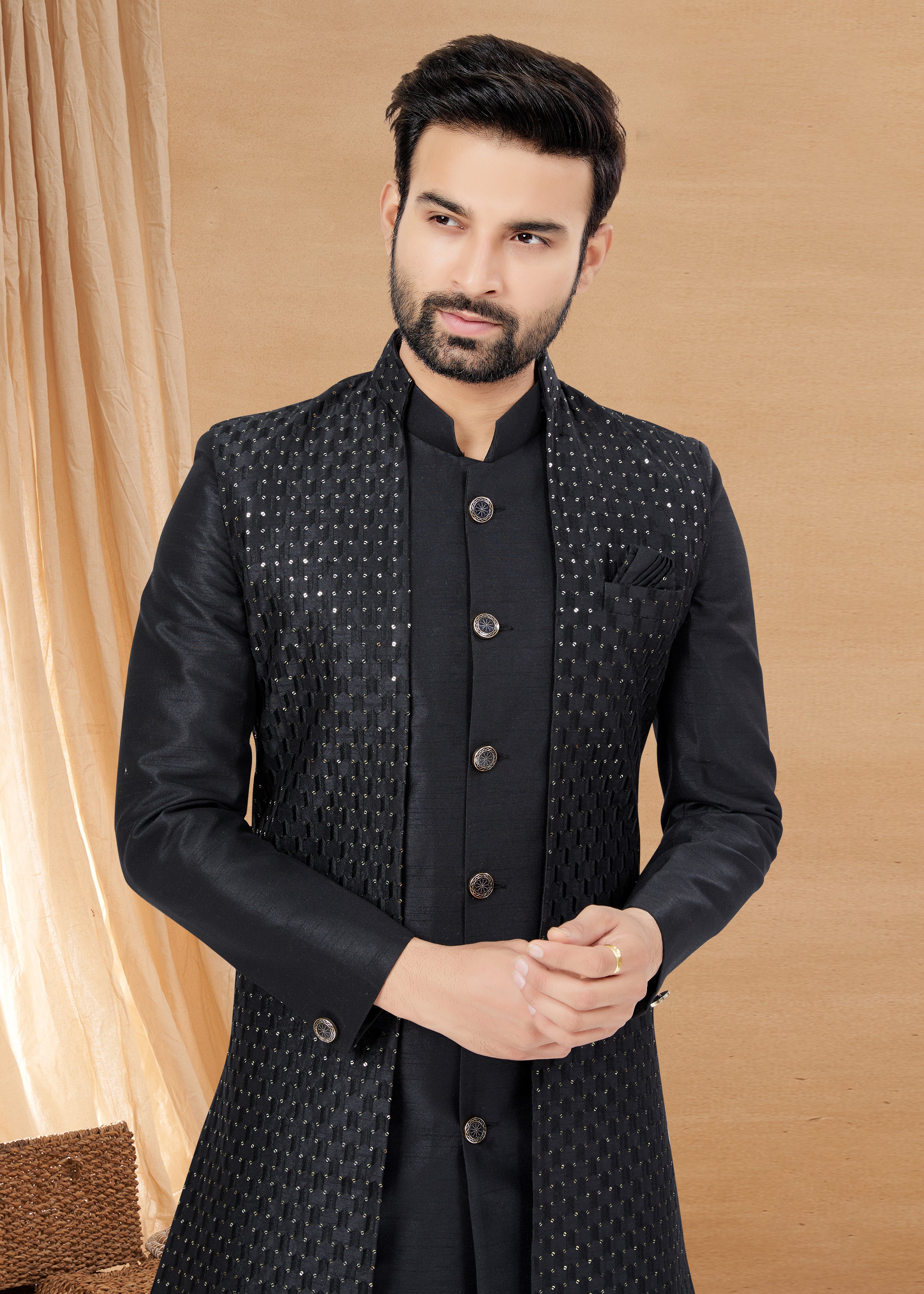 Exclusive Contrasting black Thread and Detailed Embroidery Work Indo Western, Sherwani | Indian Traditional Mens Wear.