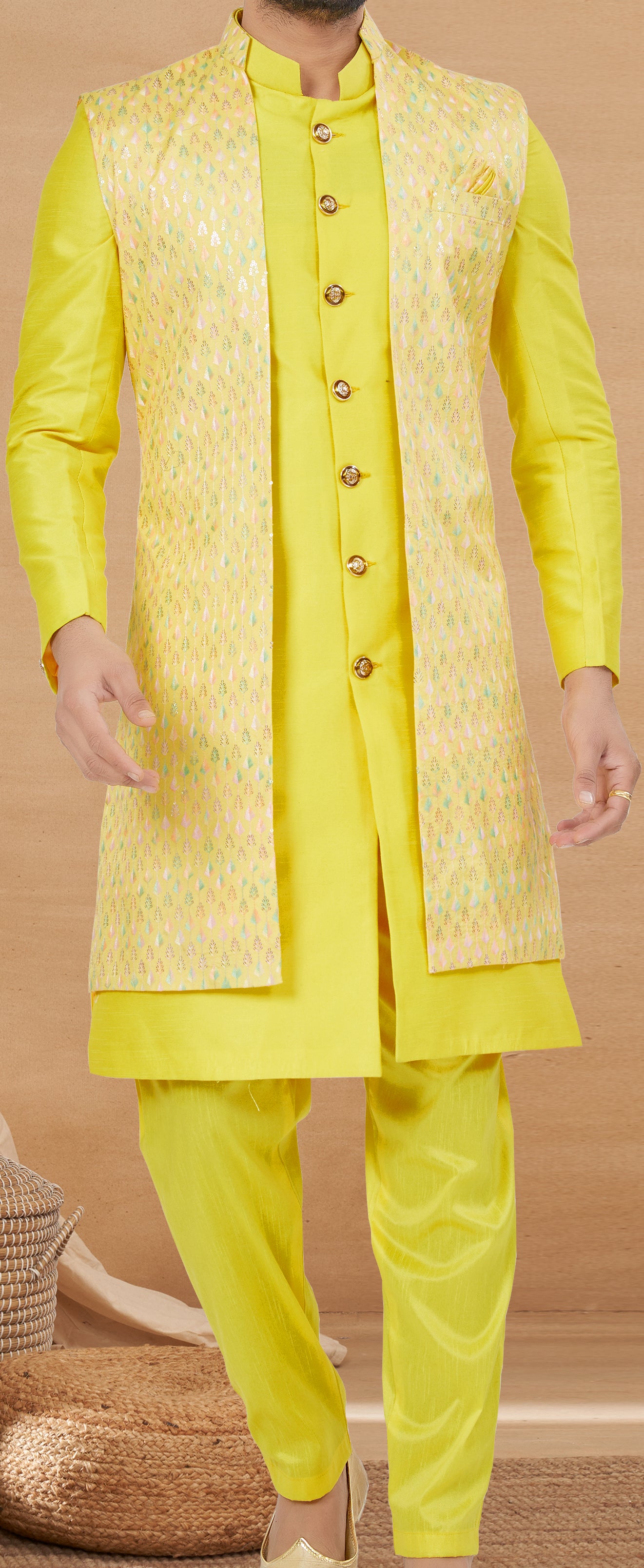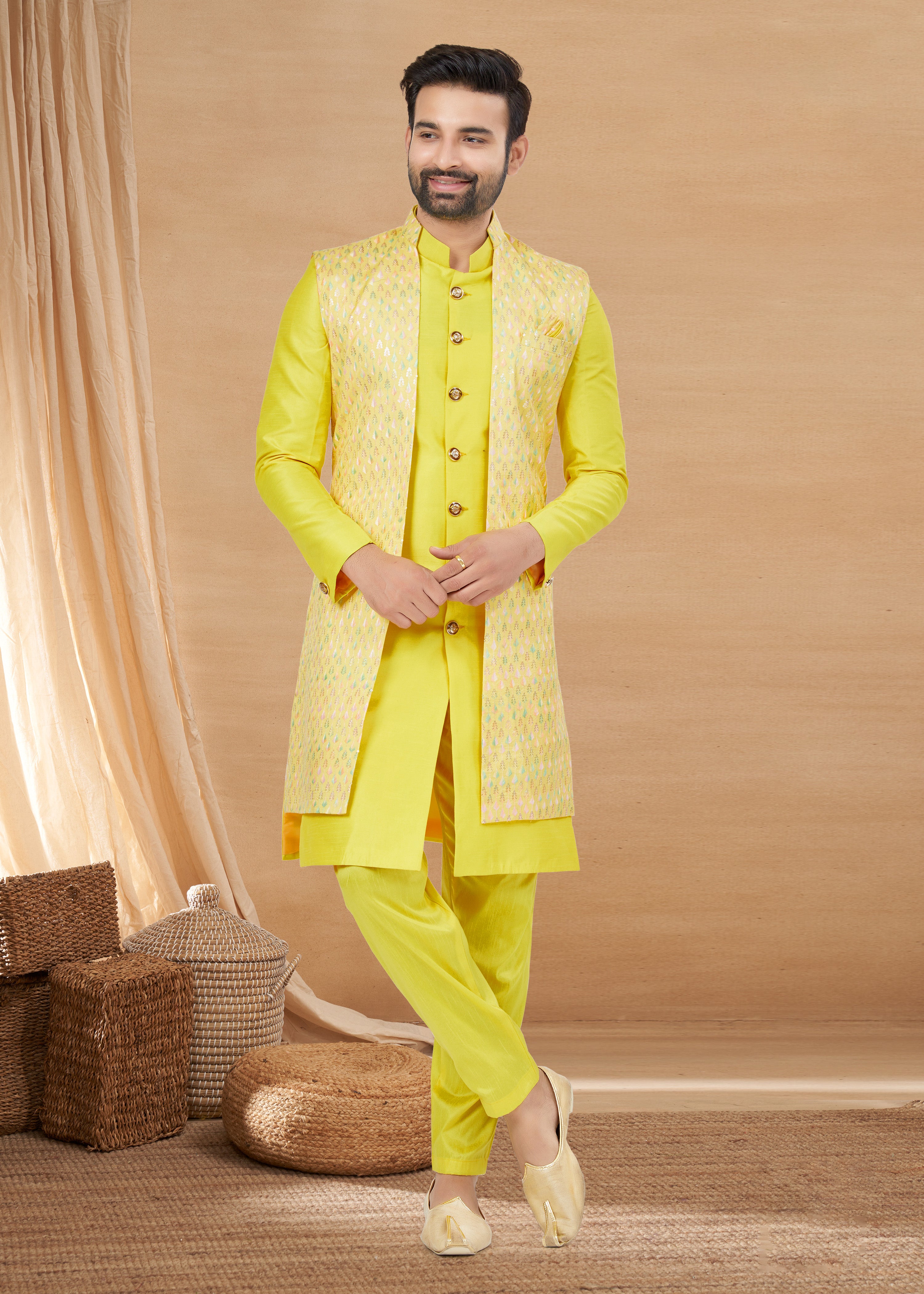 Exclusive Contrasting yellow Thread and Detailed Embroidery Work Indo Western, Sherwani | Indian Traditional Mens Wear