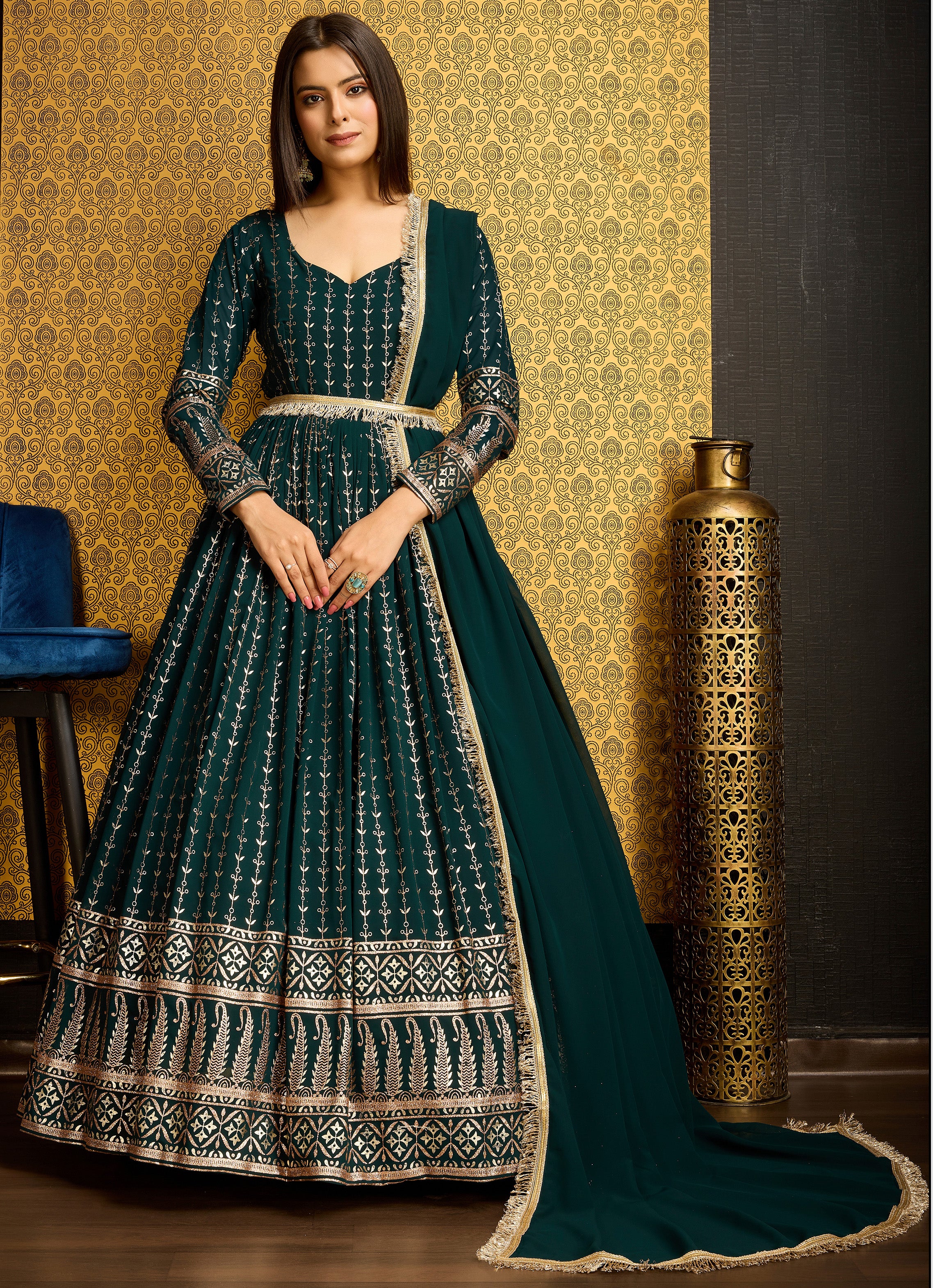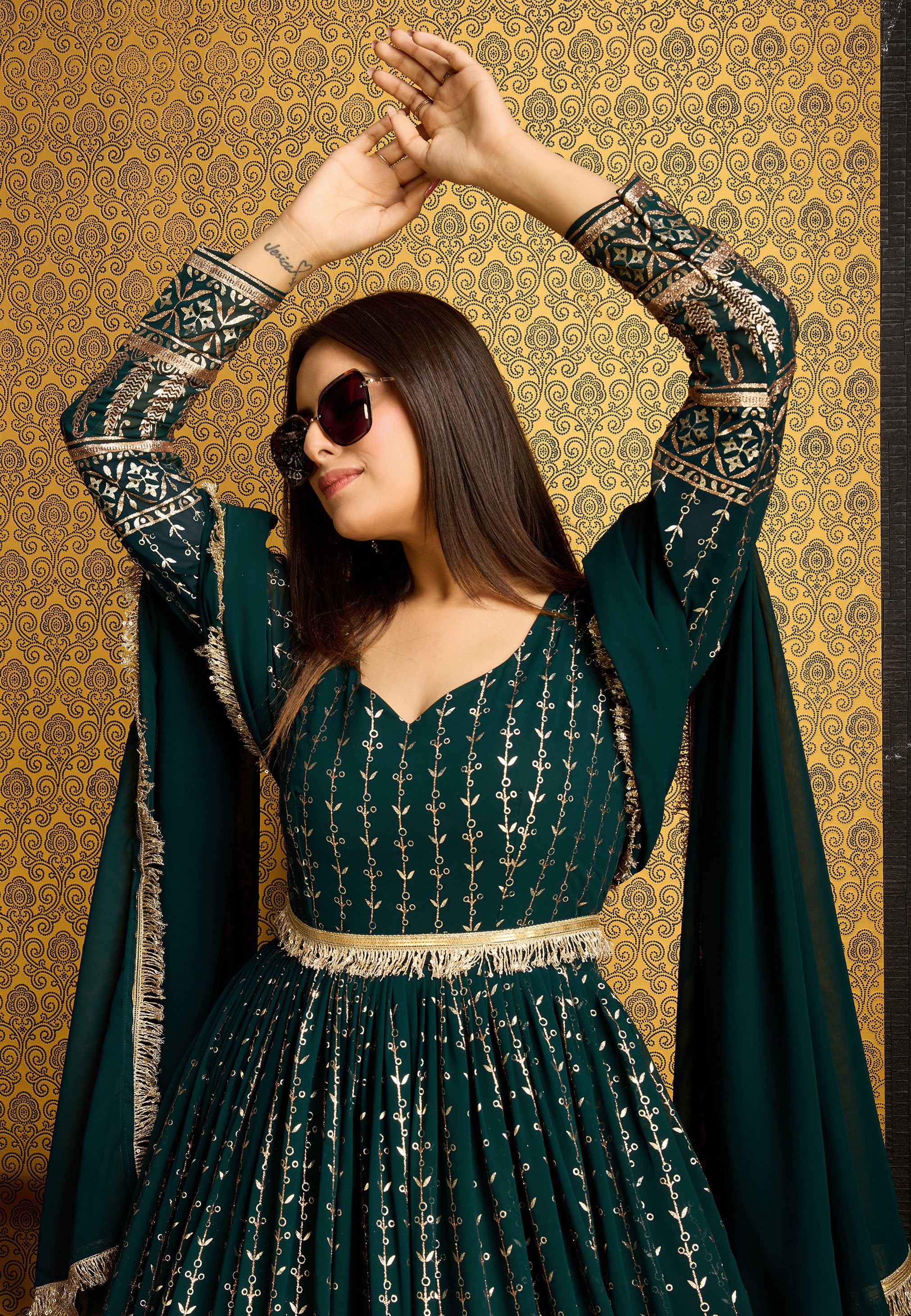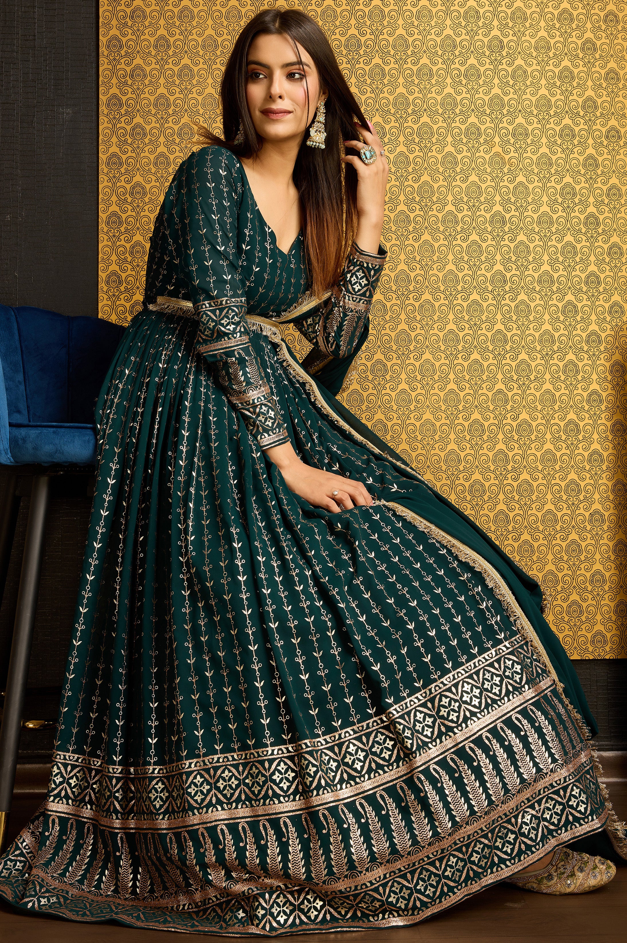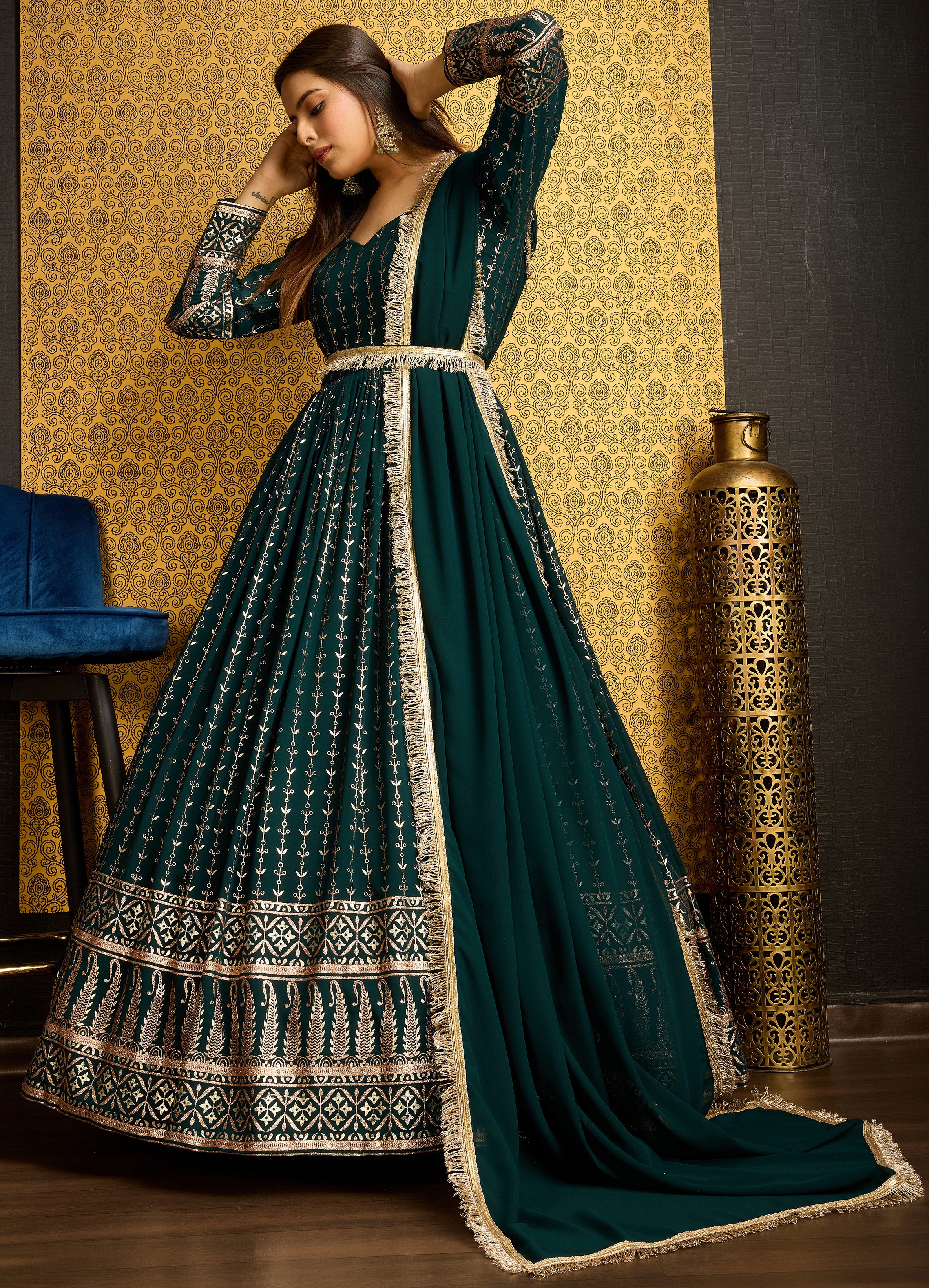 Exclusive Designer Green Gown on georgette with detailed metallic foil work and handwork on neck