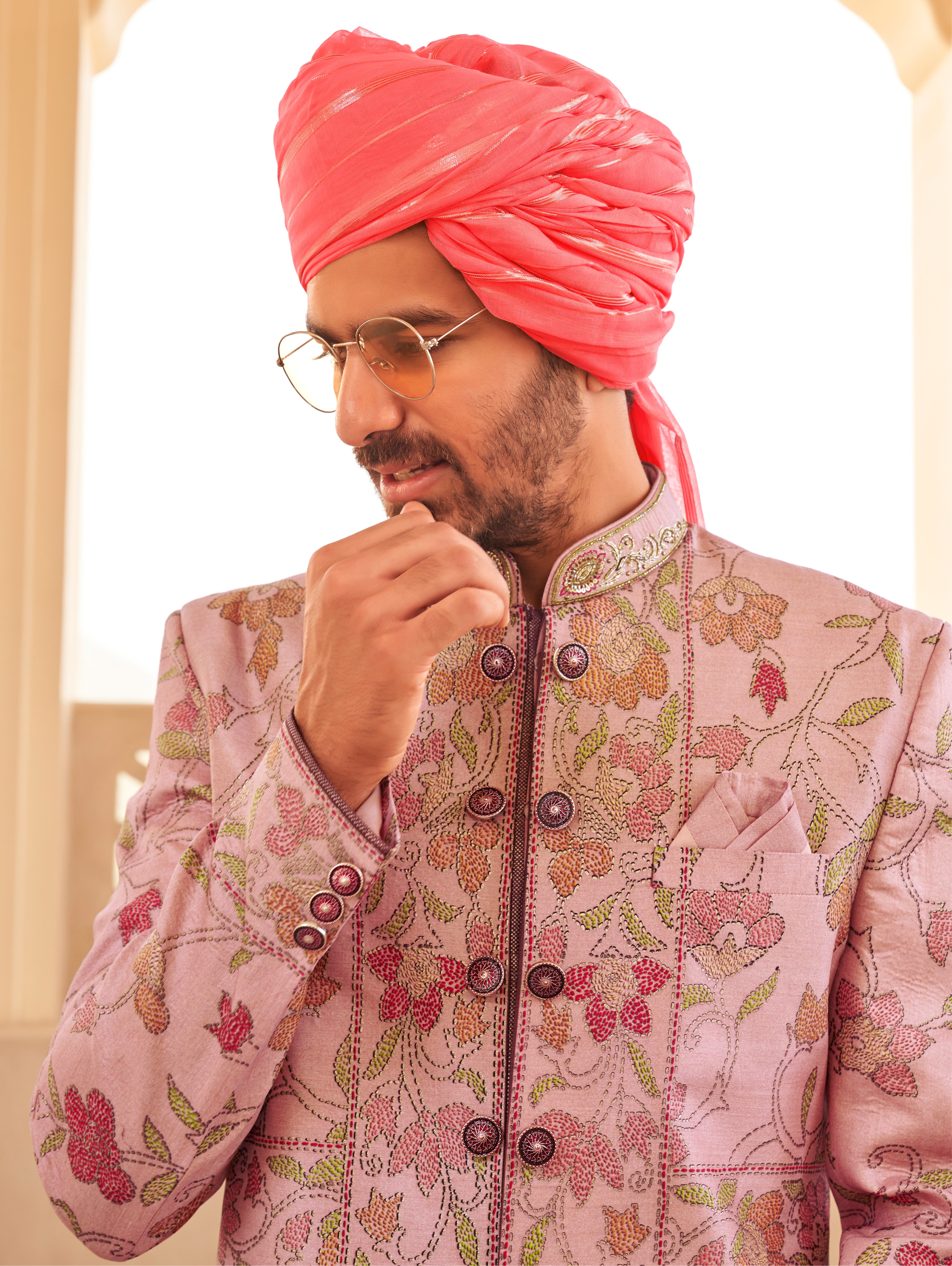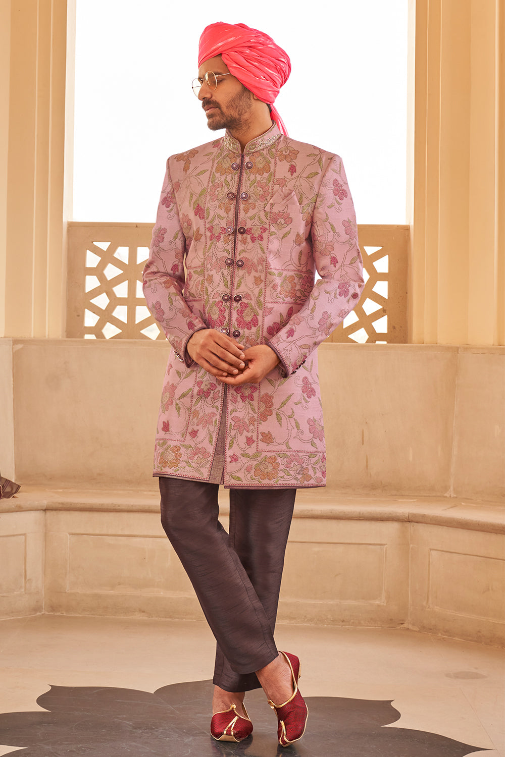 Exclusive latest designer mens indowestern sherwani kurta in pure pv silk and foil print with handwork