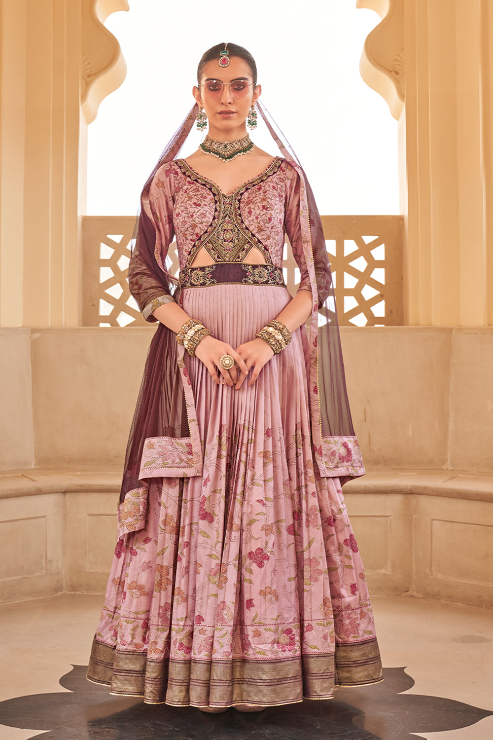 Women Gown : - Gown PV Silk With Foil Print With Net Dupatta.