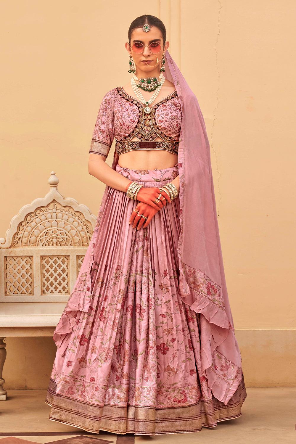 Exclusive latest Light Pink designer Lehenga in pure pv silk and foil print with detailed embroidery, hand and mirror work