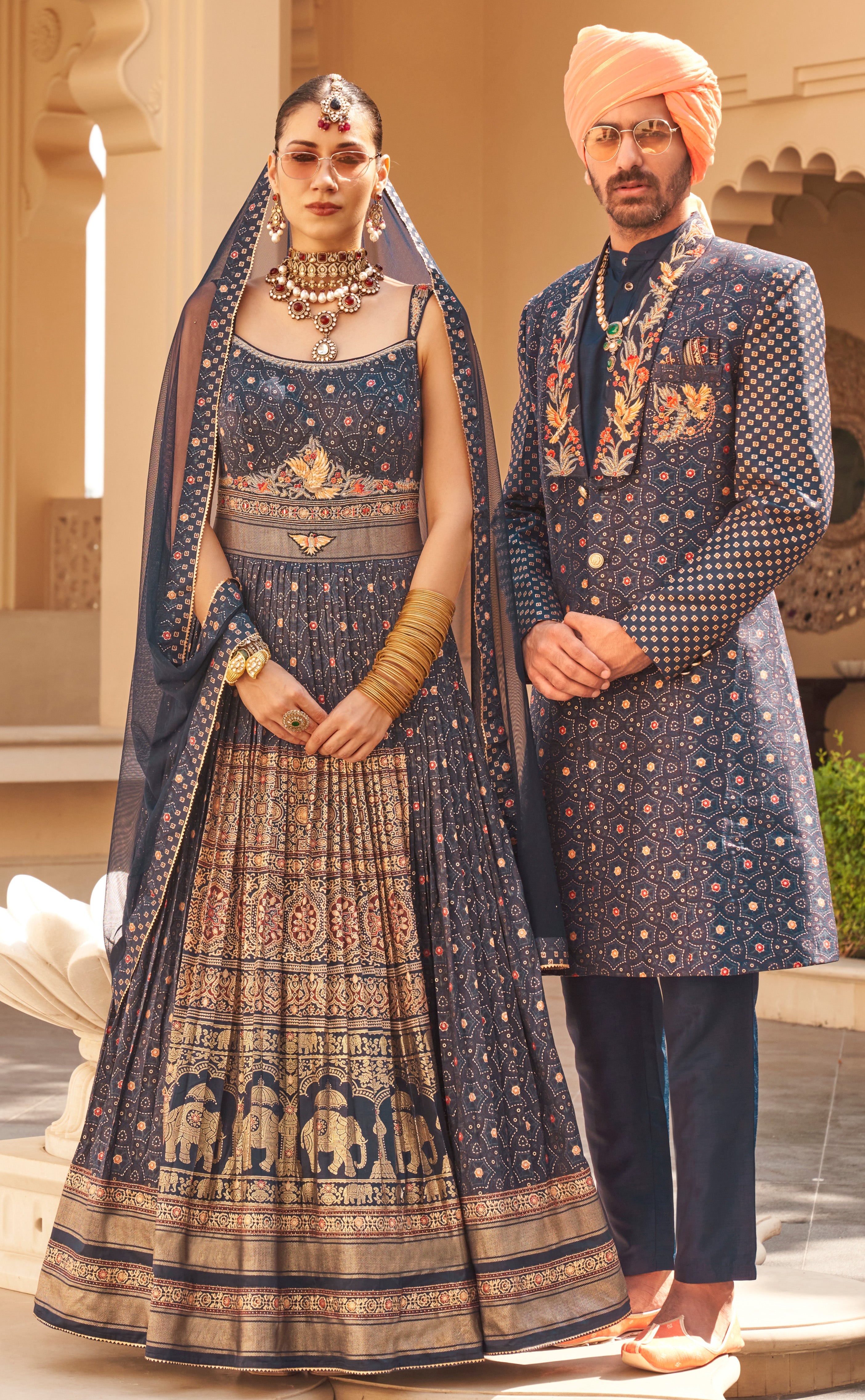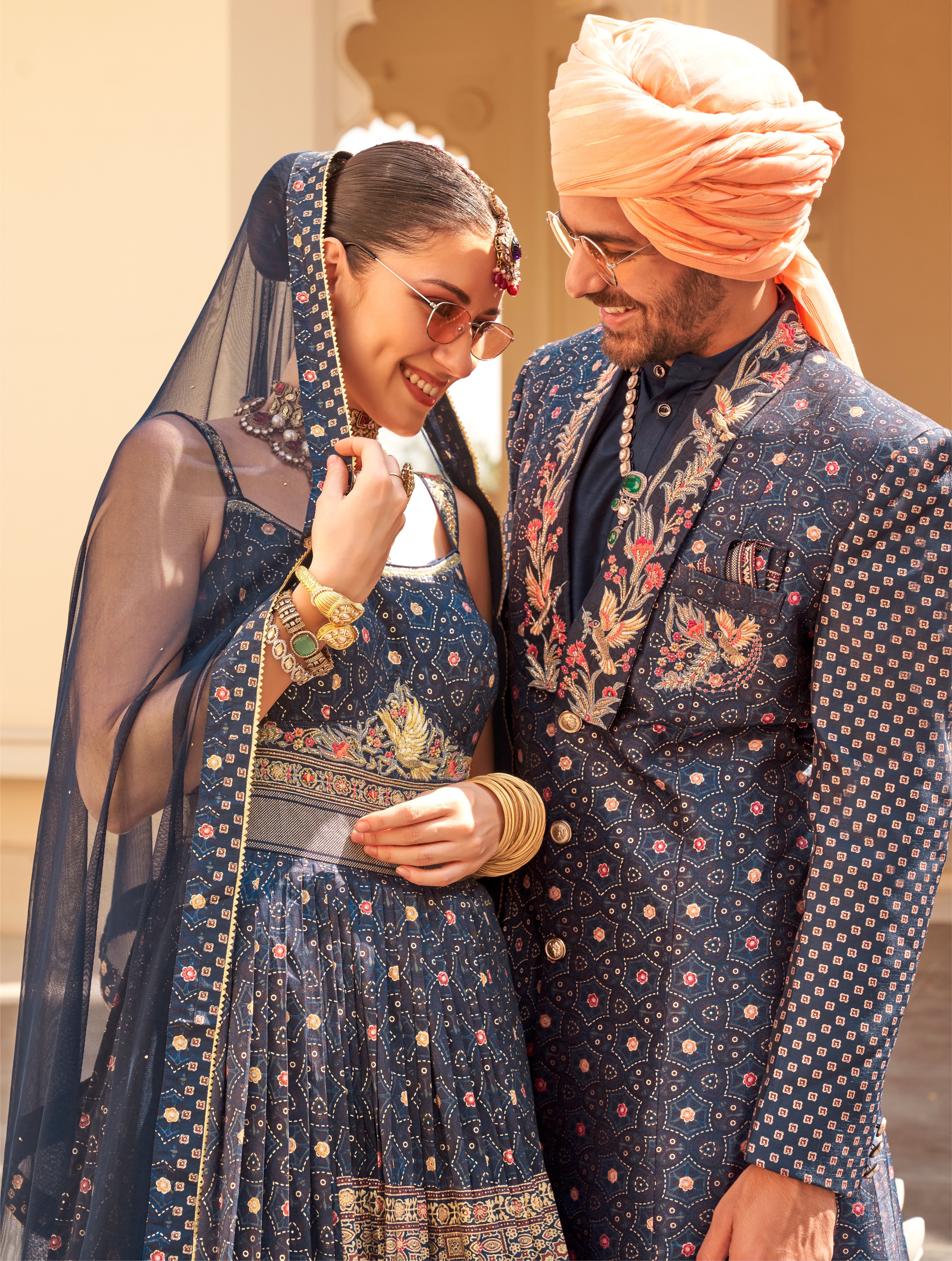 Exclusive latest Royal Blue designer Gown in pure pv silk and foil print with net dupatta detailed embroidery, hand and mirror work