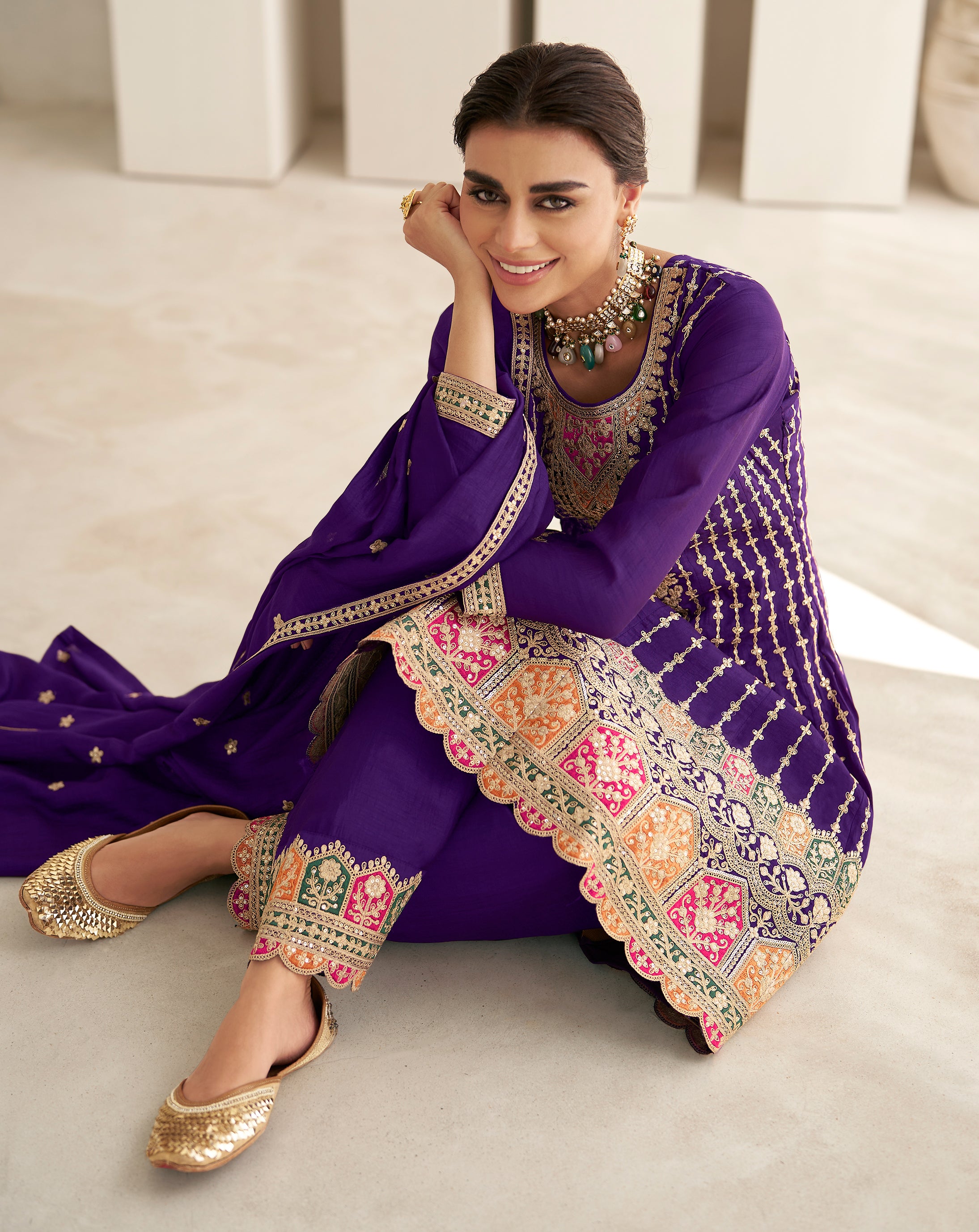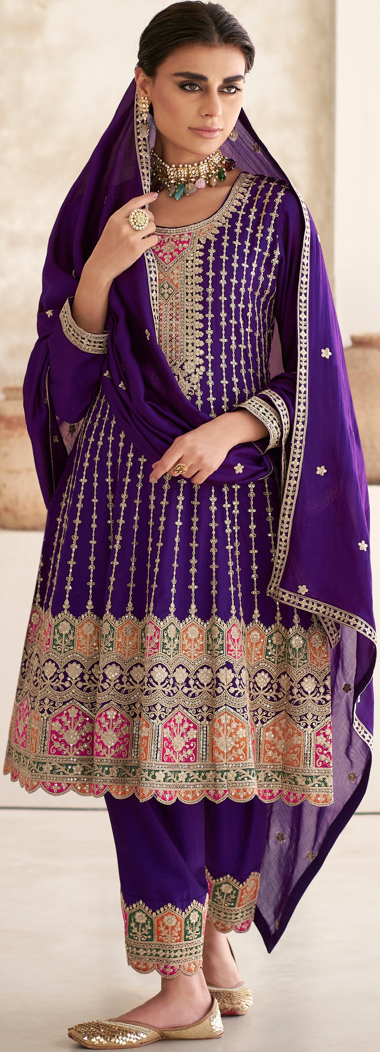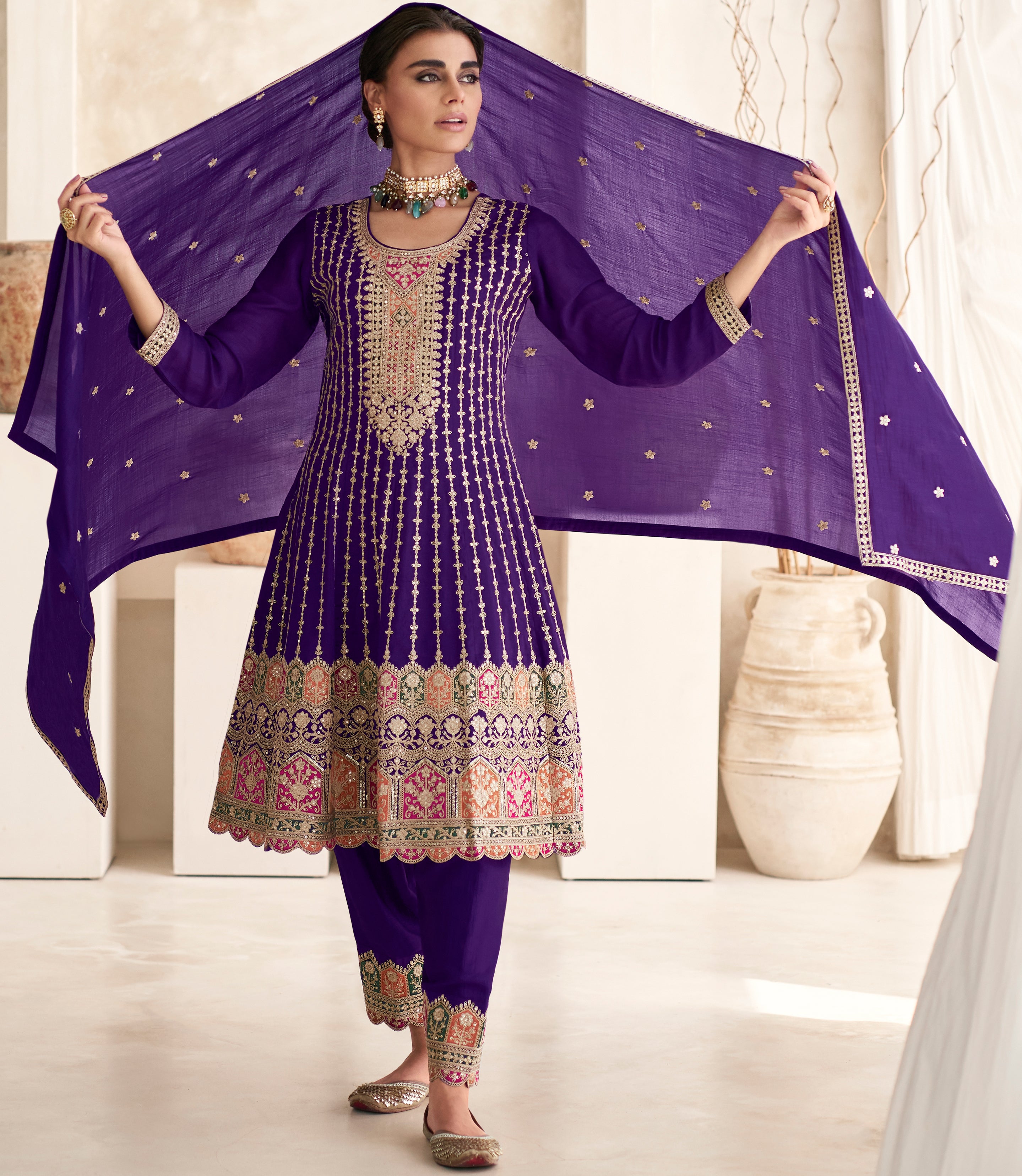 Exclusive Purple Pure Silk Designer Flared Salwar Suit with Detailed Embroidery | Salwar Kameez | Designer Dress
