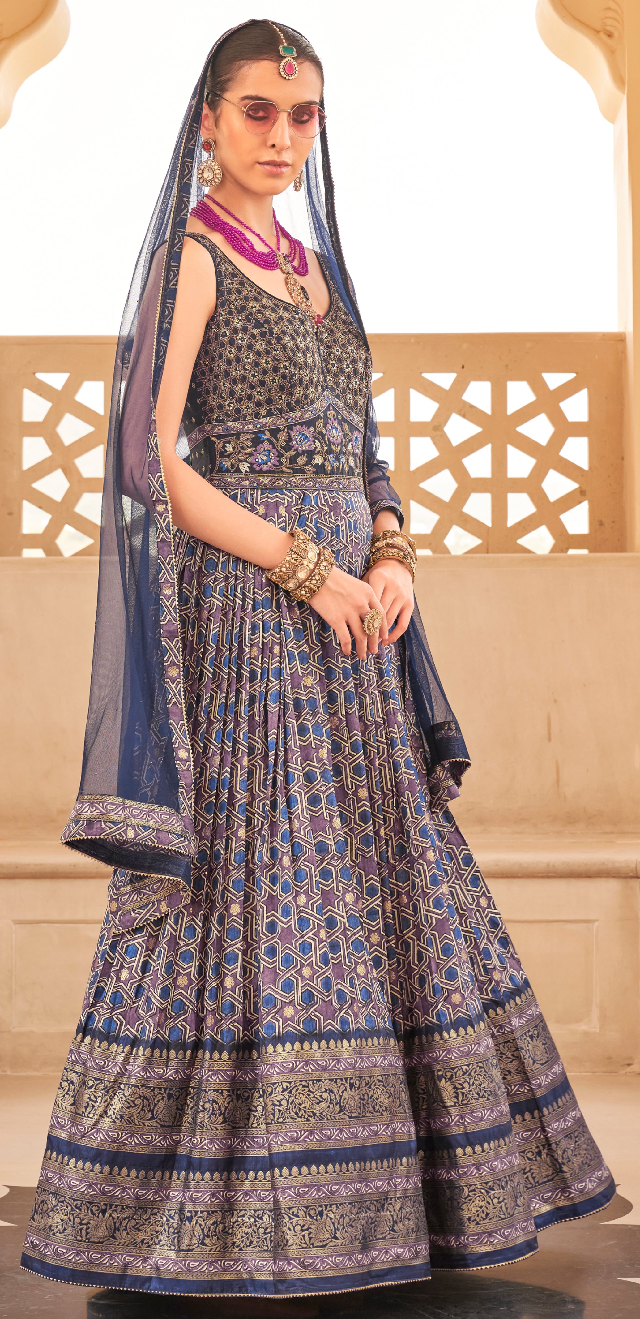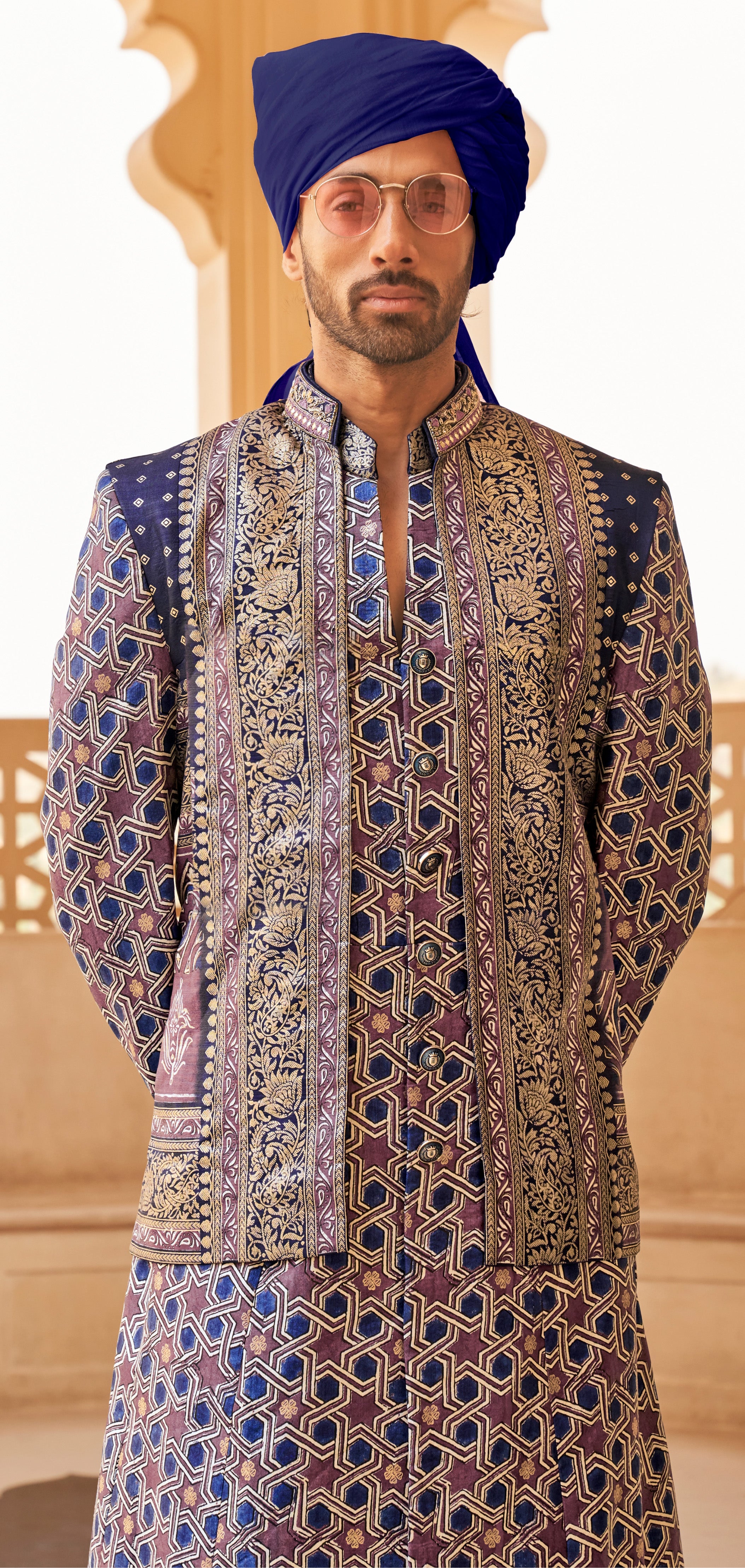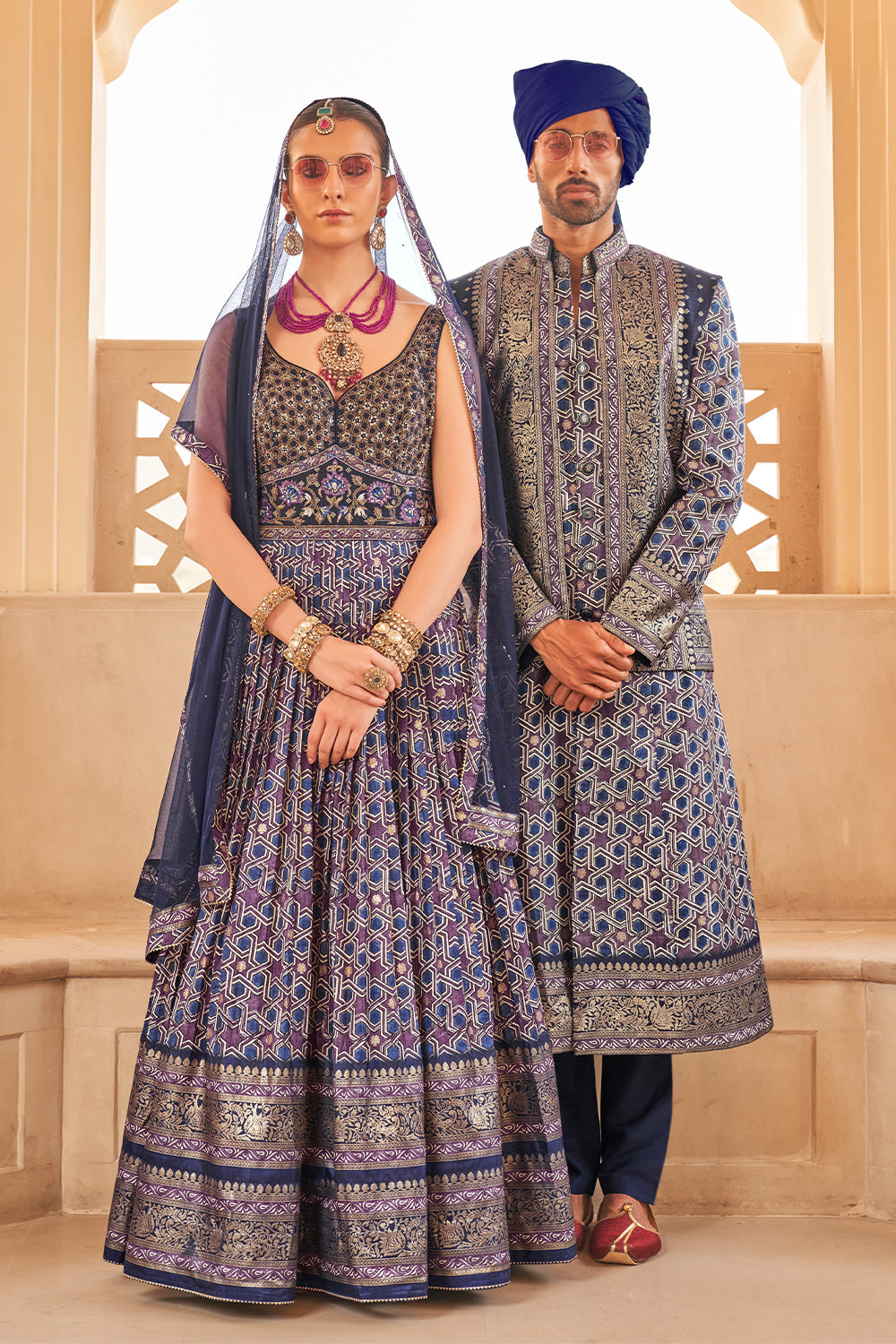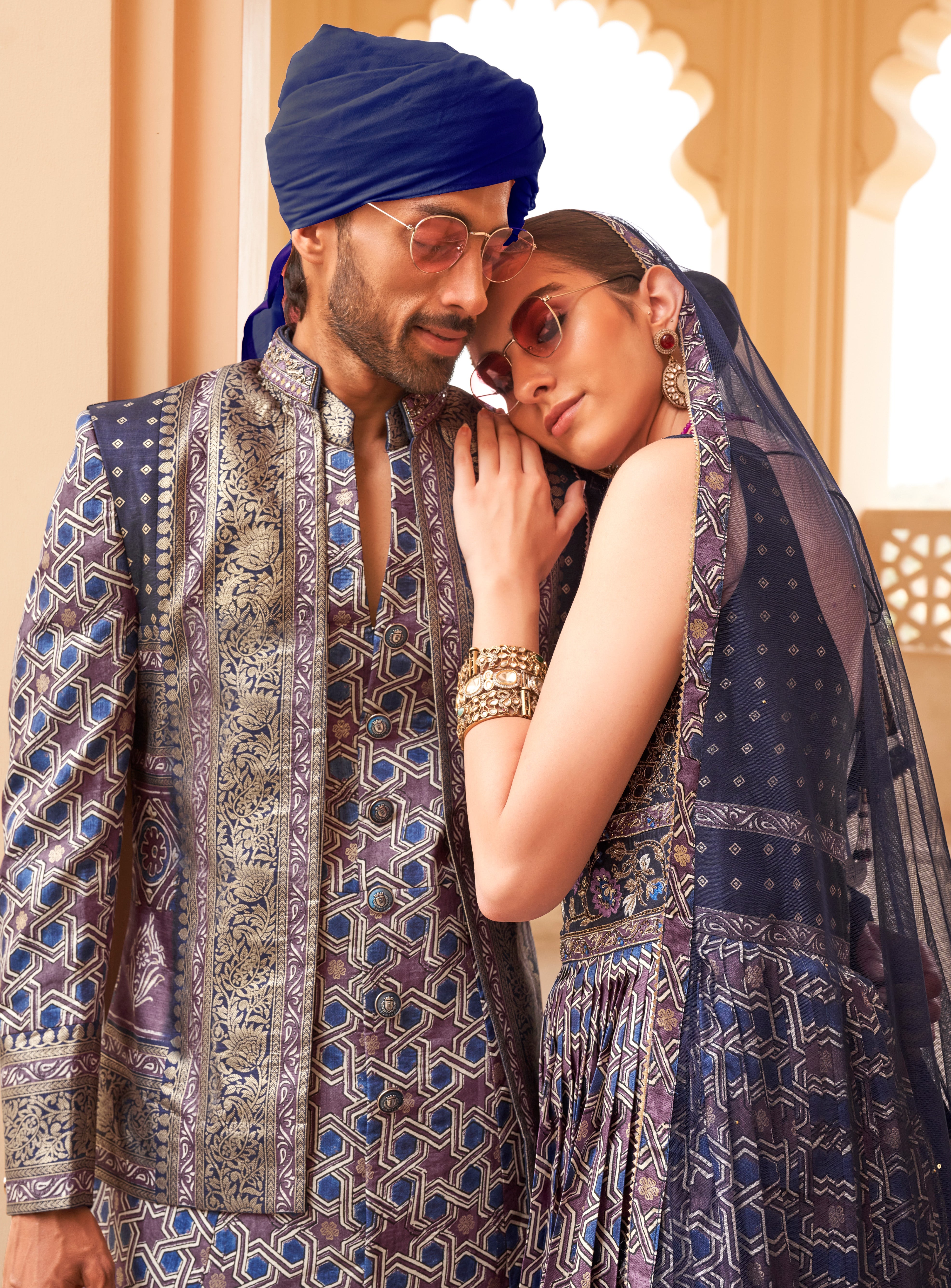 Exclusively for couple combo Blue designer outfit in pure pv silk and foil print with detailed hand mirror work