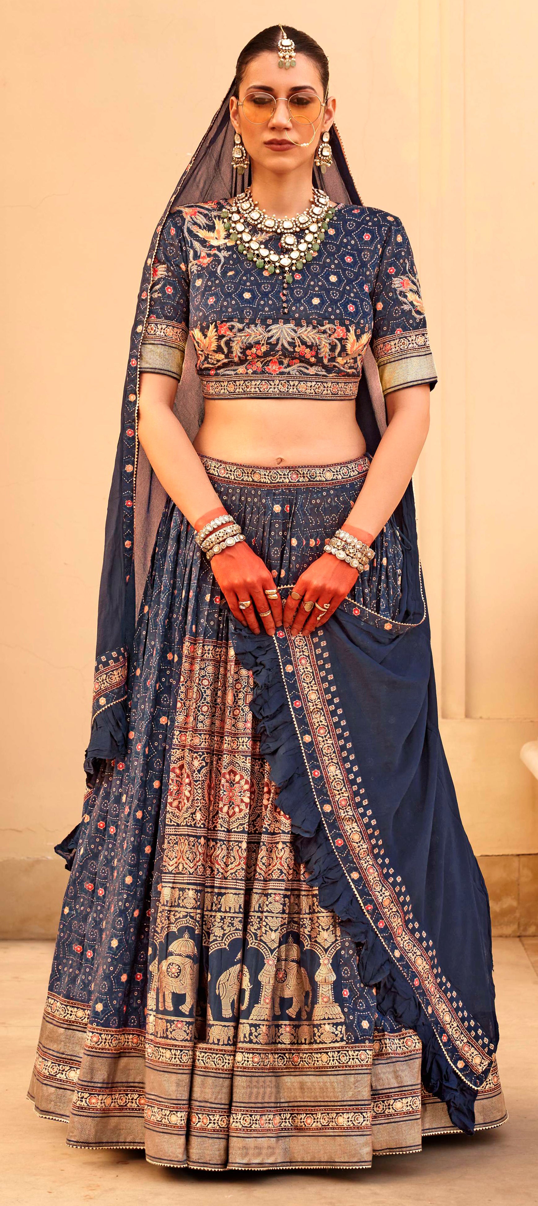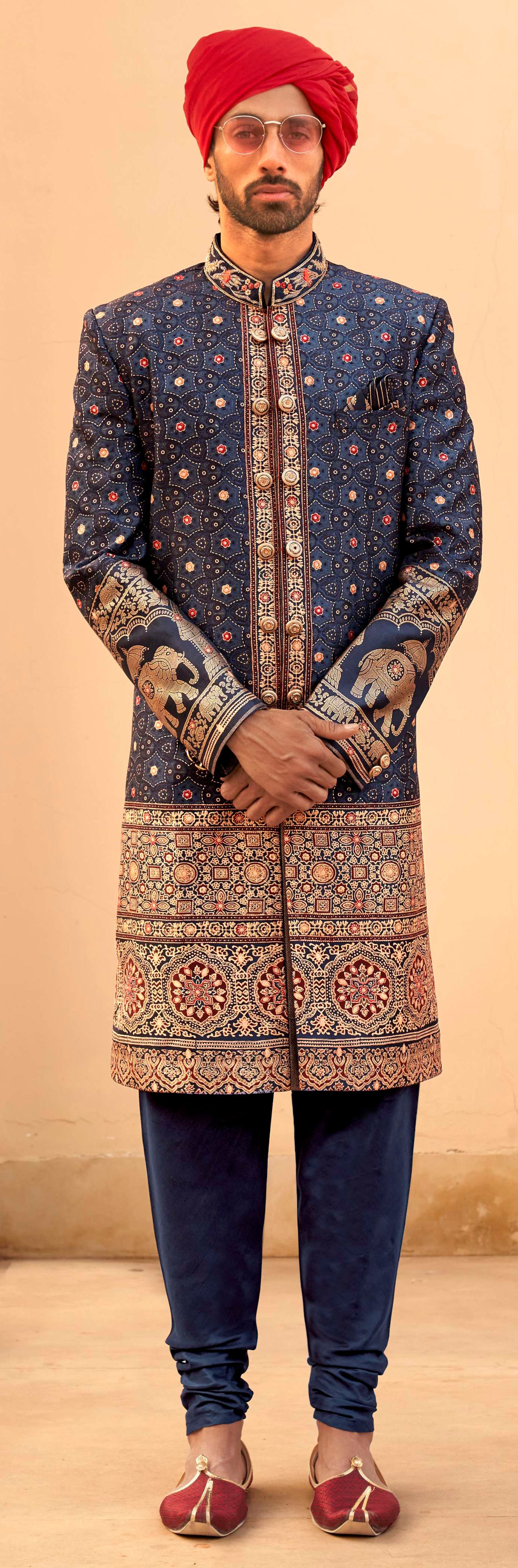 Exclusively for couple combo Blue designer outfit in pure pv silk and foil print with detailed hand mirror work