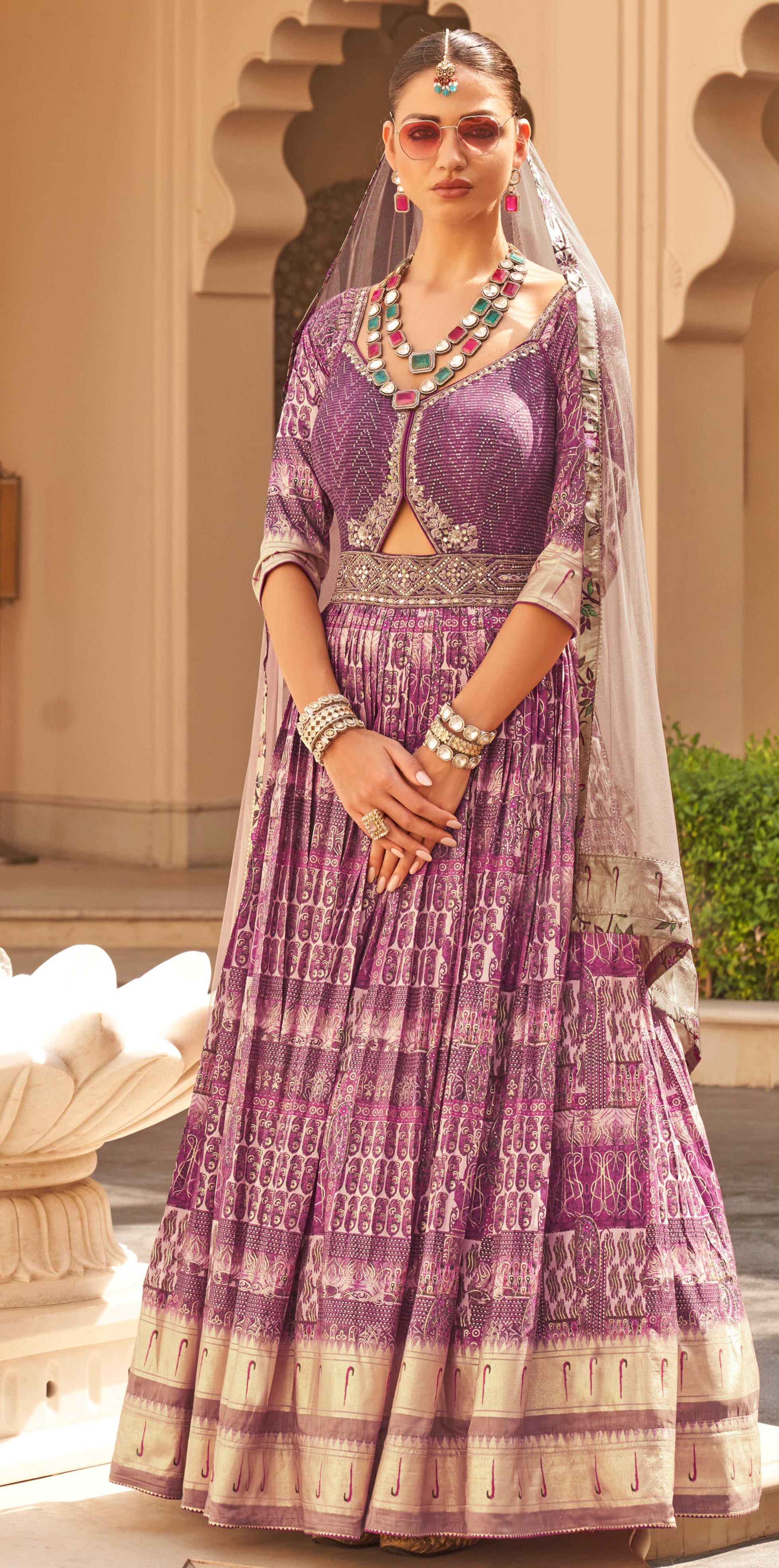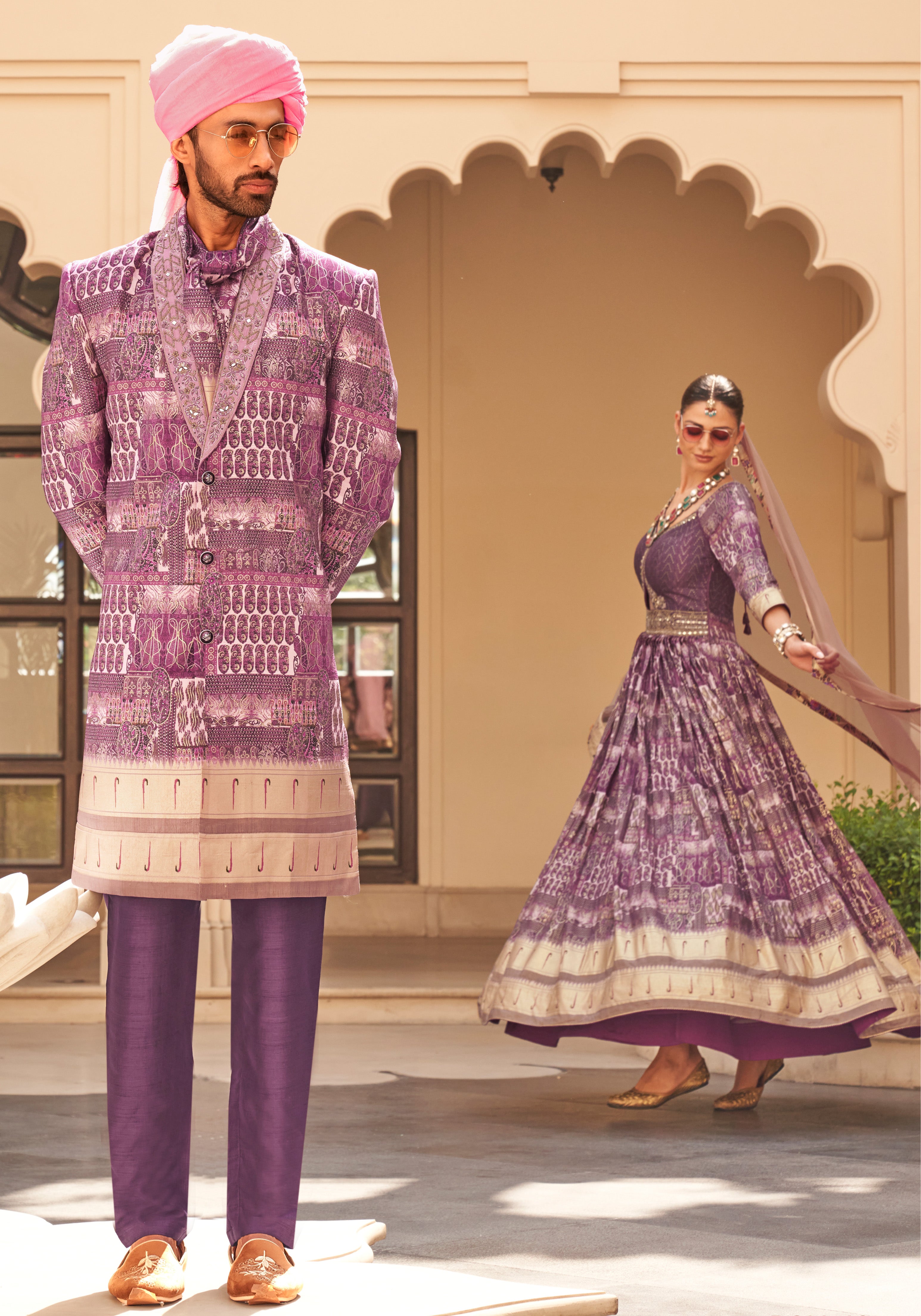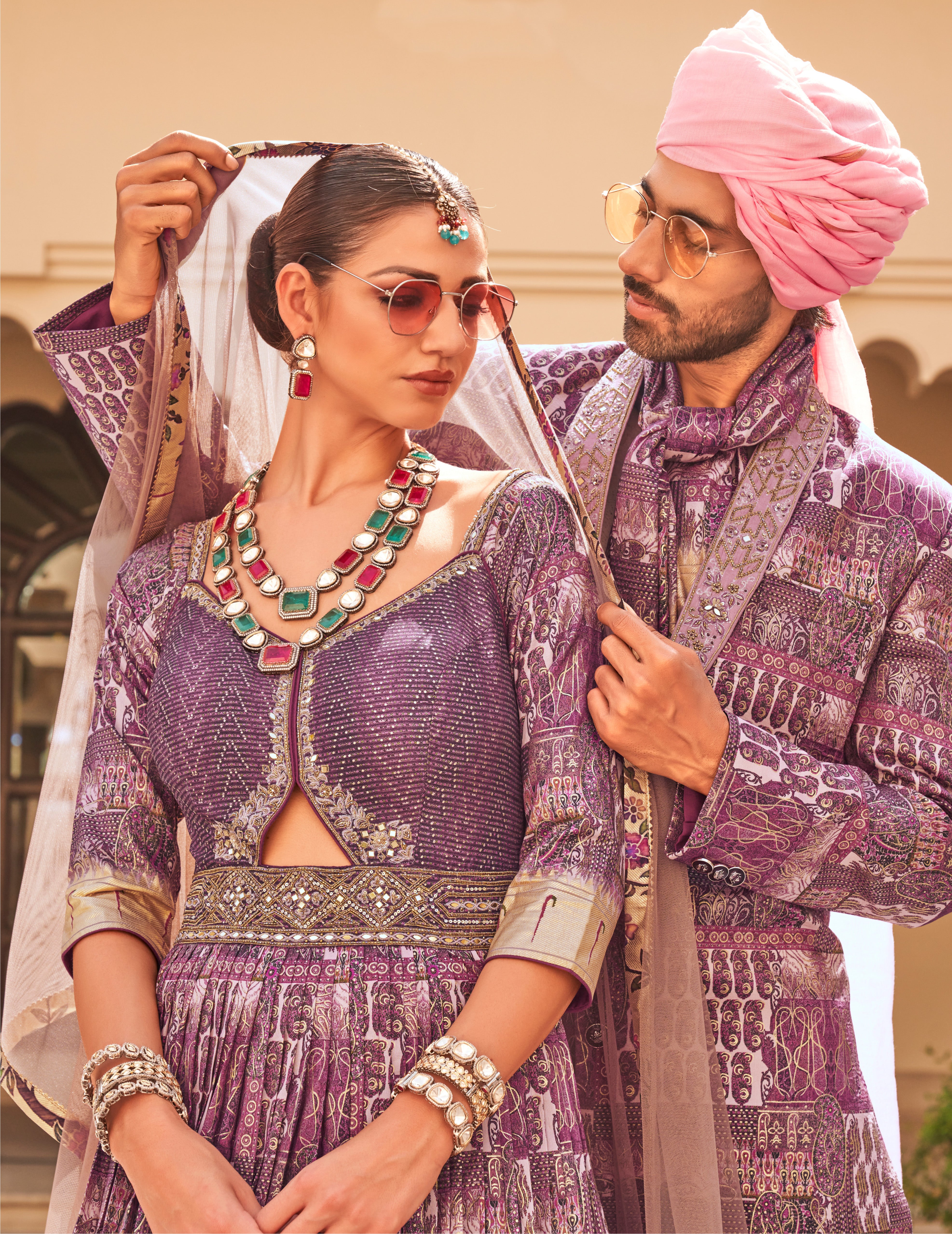 Exclusively for couple combo Purple designer outfit in pure pv silk and foil print with detailed hand mirror work
