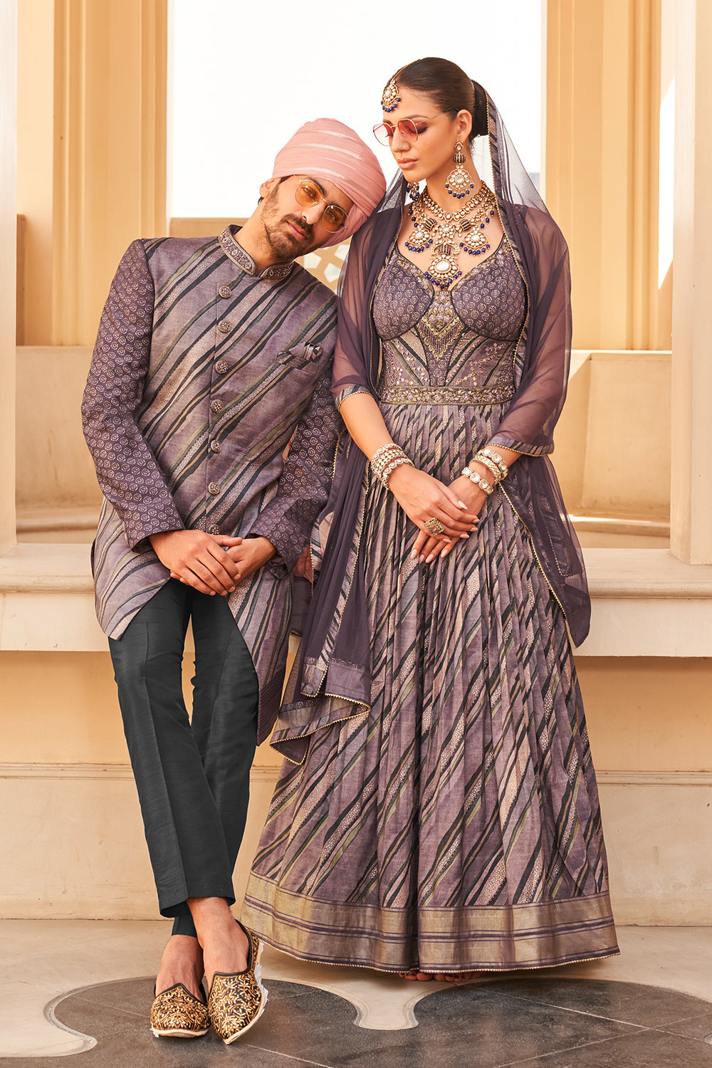 Exclusively for couple combo purple designer outfit in pure PV silk and foil print with detailed hand mirror work
