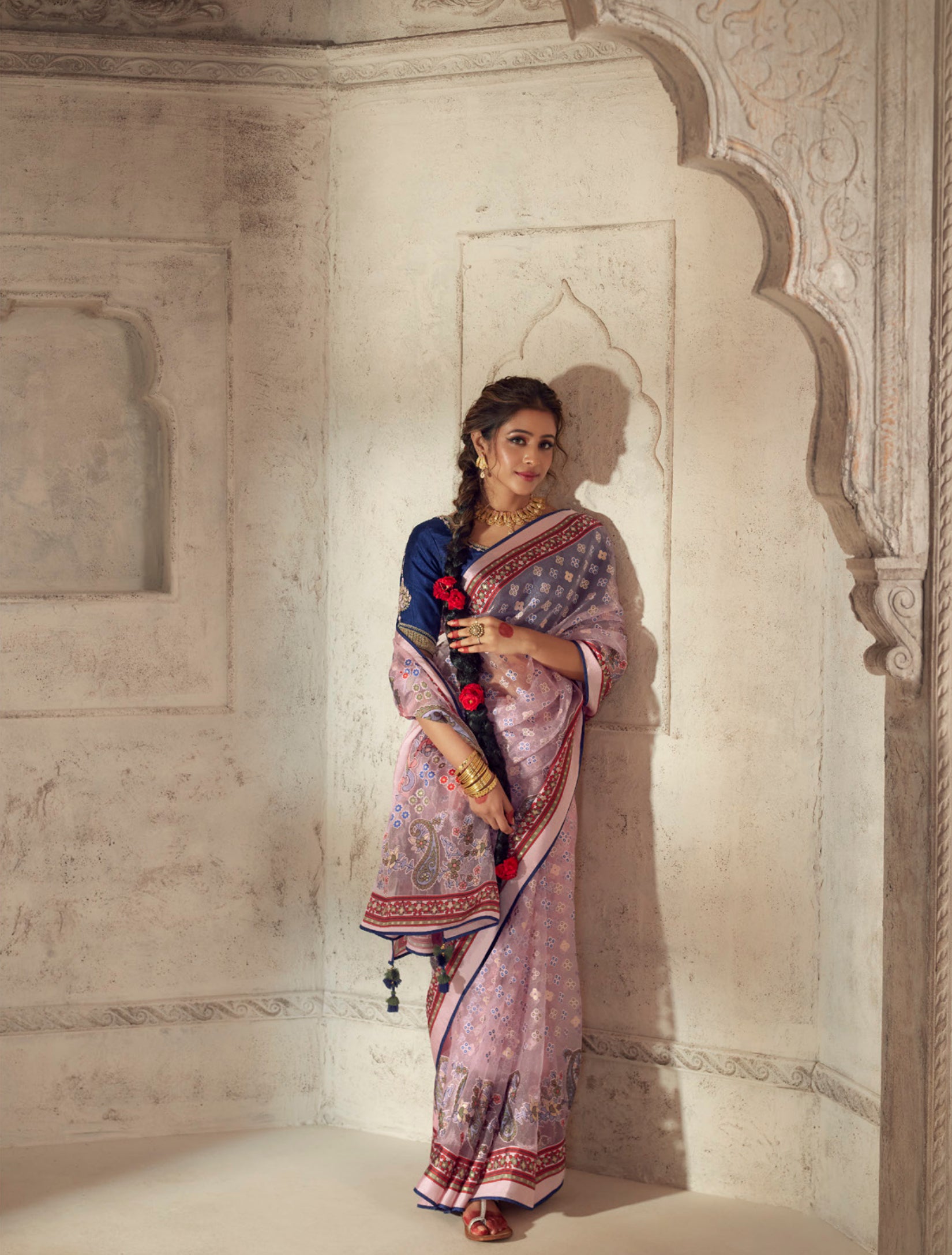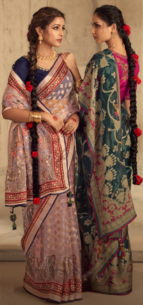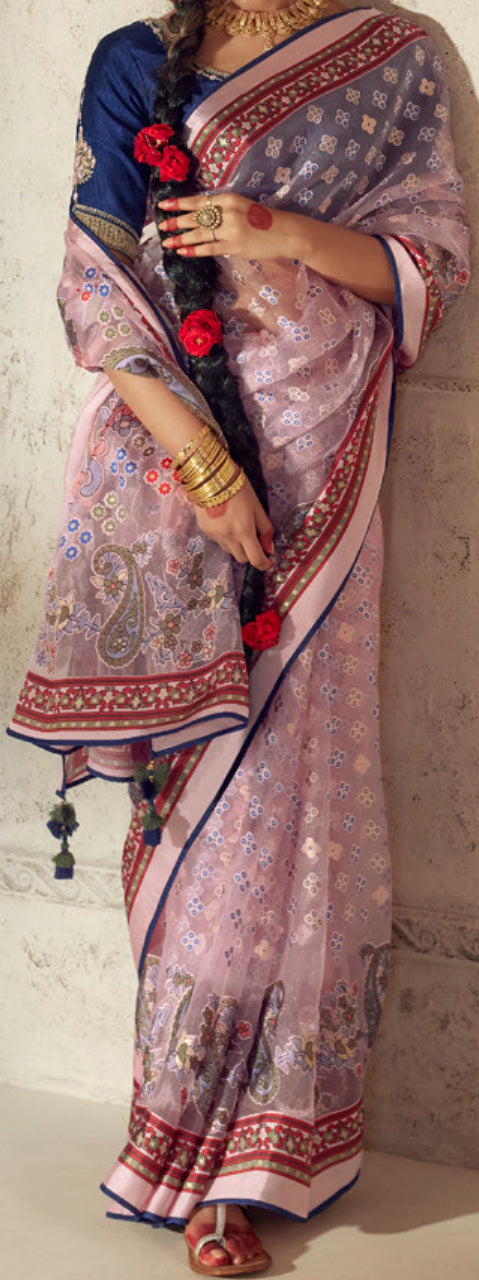 Exquisite Contrasting Light Pink Floral Organza saree with beautiful print, piping work or tassels on pallu | party wear saree | Festive saree