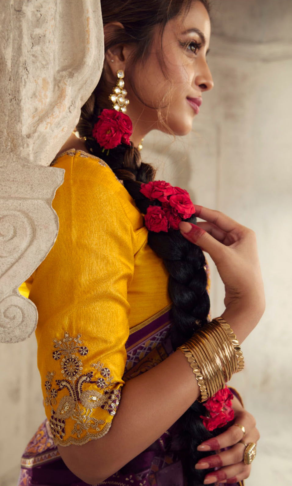 Exquisite Contrasting Purple Floral Organza saree with beautiful print, piping work or tassels on pallu | party wear saree | Festive saree