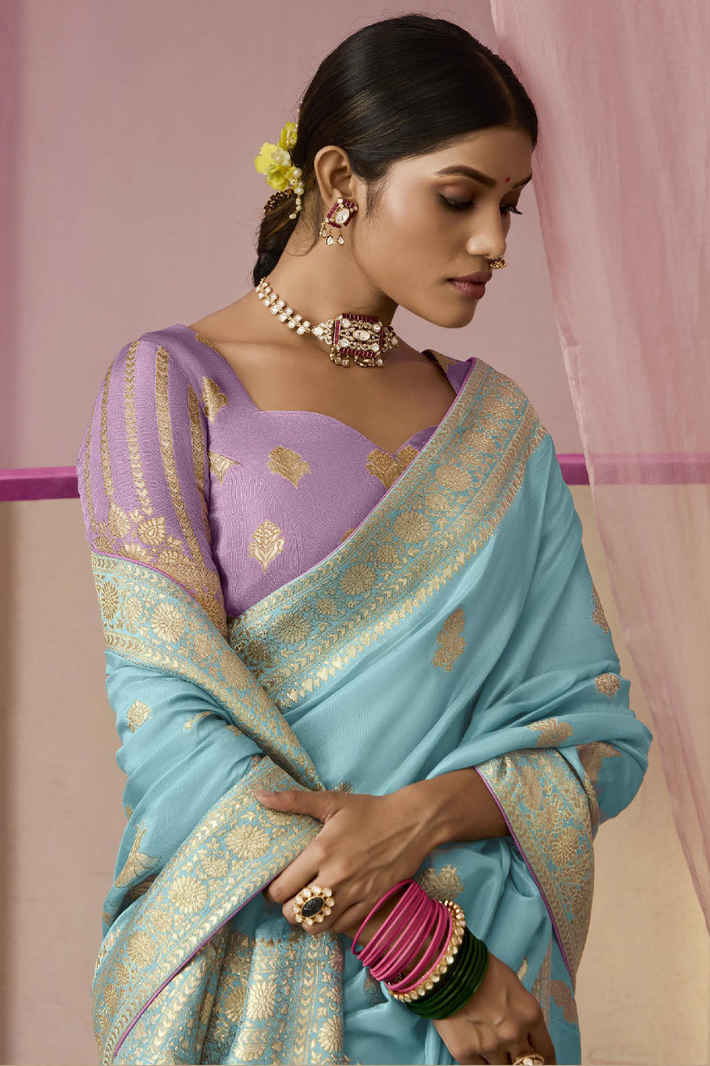 Light Blue Dola Viscose Silk Saree Intricate Flower Pattern Weaving On All Over Saree