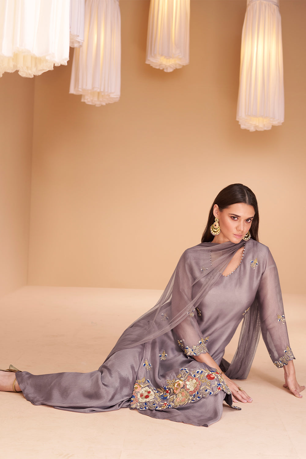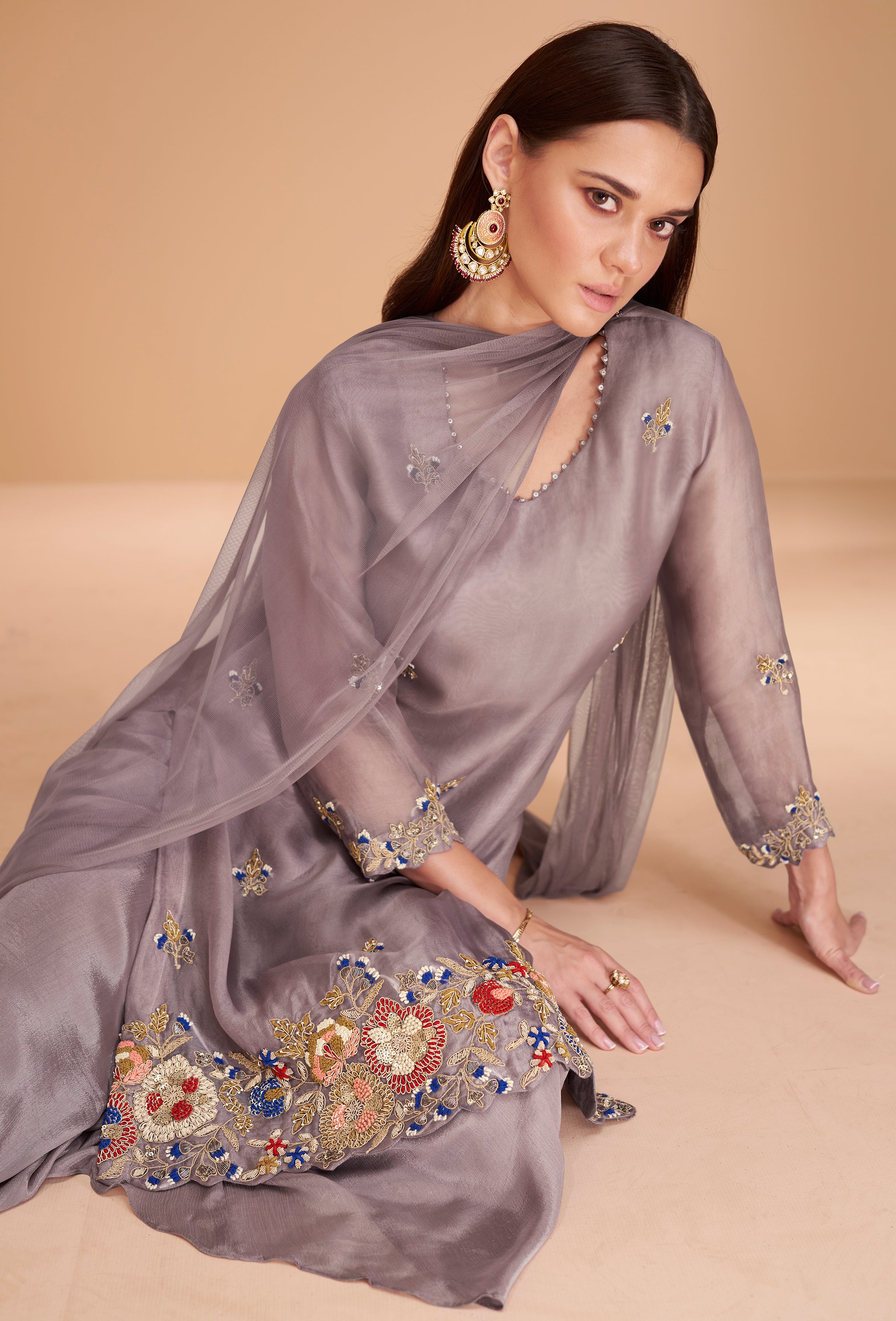 Pastel Purple Pure organza silk dress with net duppata and minimul work