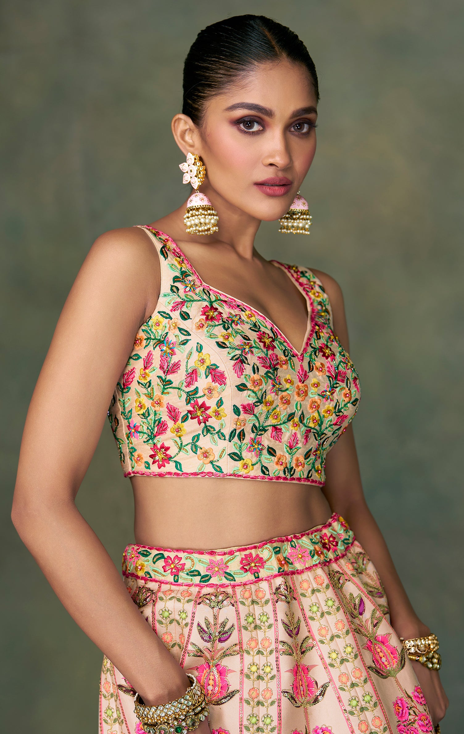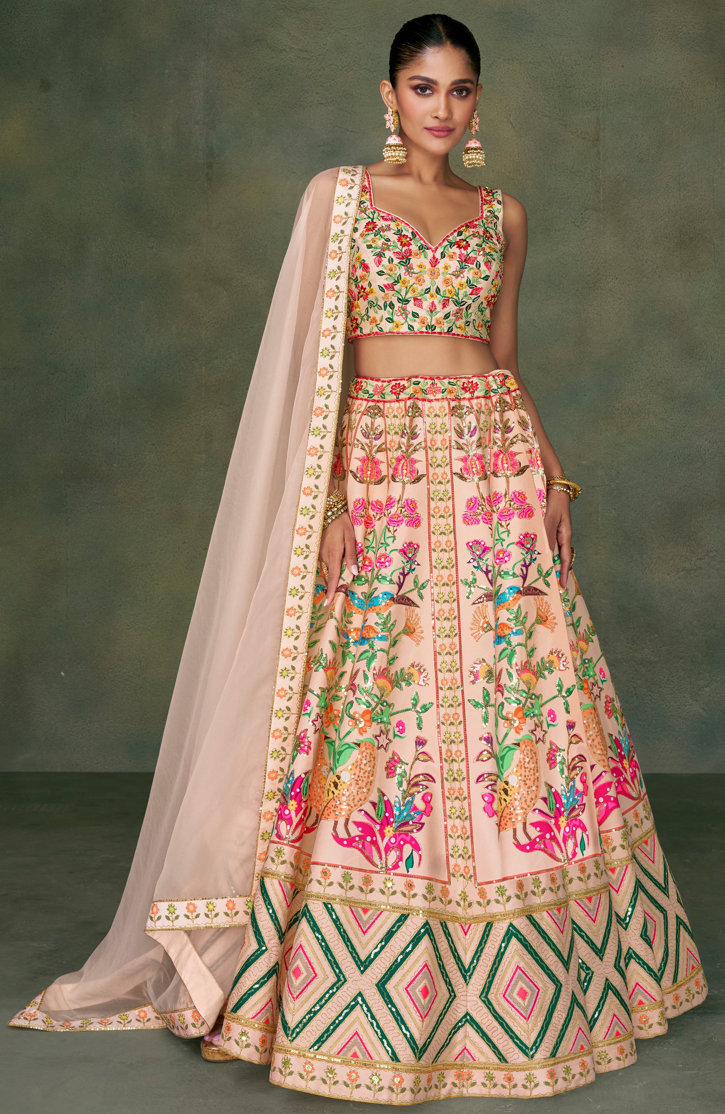 Contrasting silk designer lehenga with detailed embroidery work dupata in net