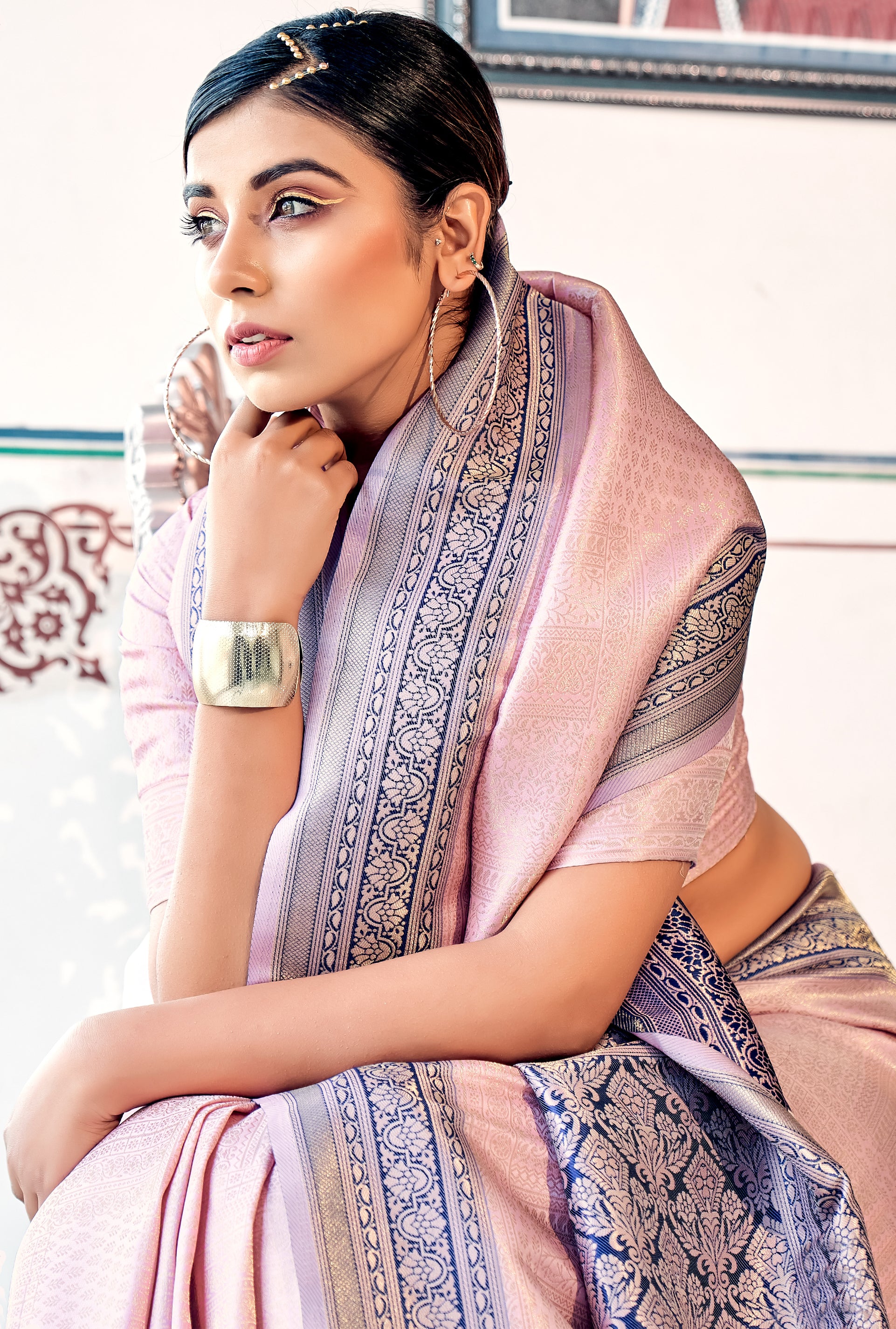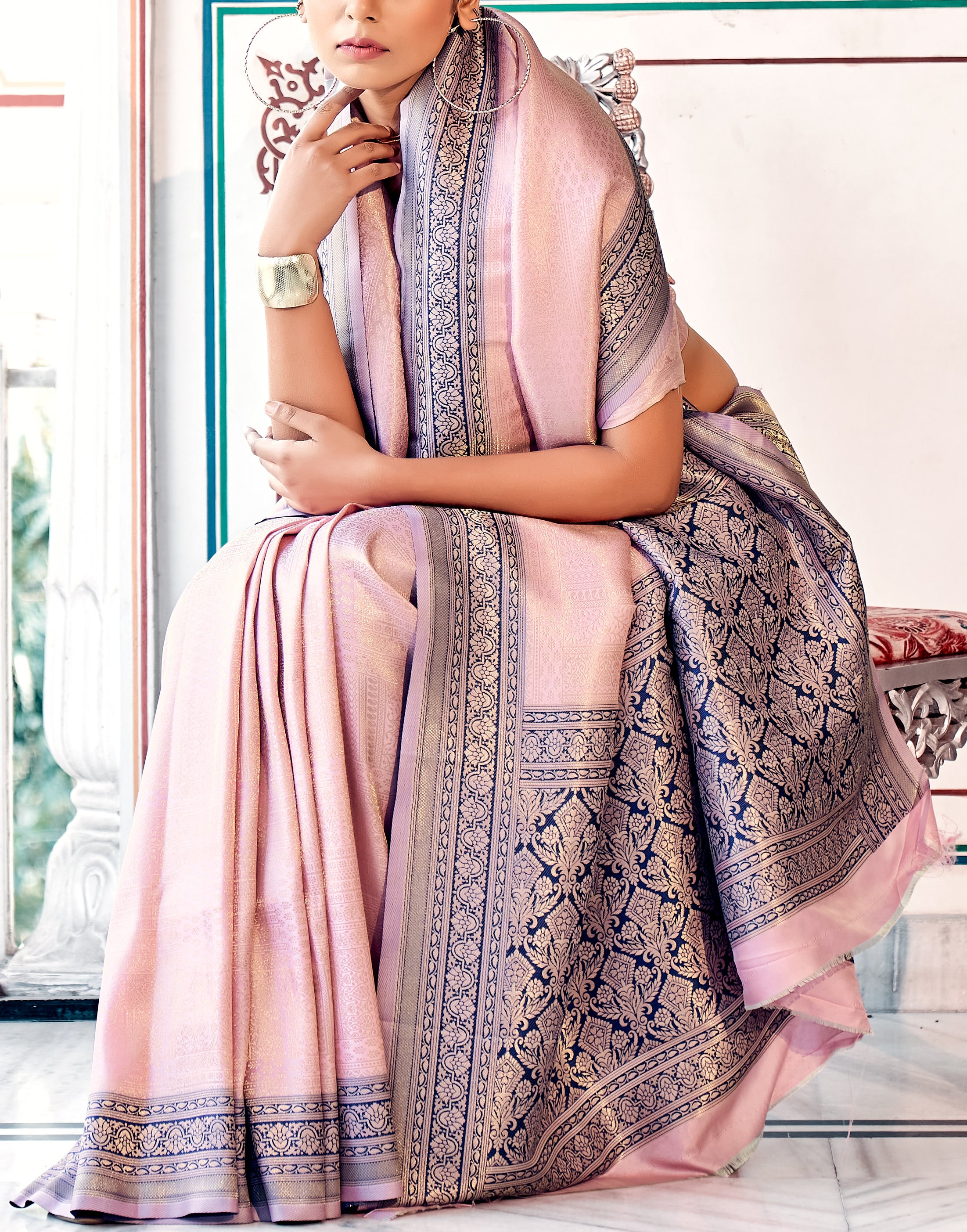 Pure Kanjivaram pastel pink light shaded weaving silk handloom saree with contrasting dark border