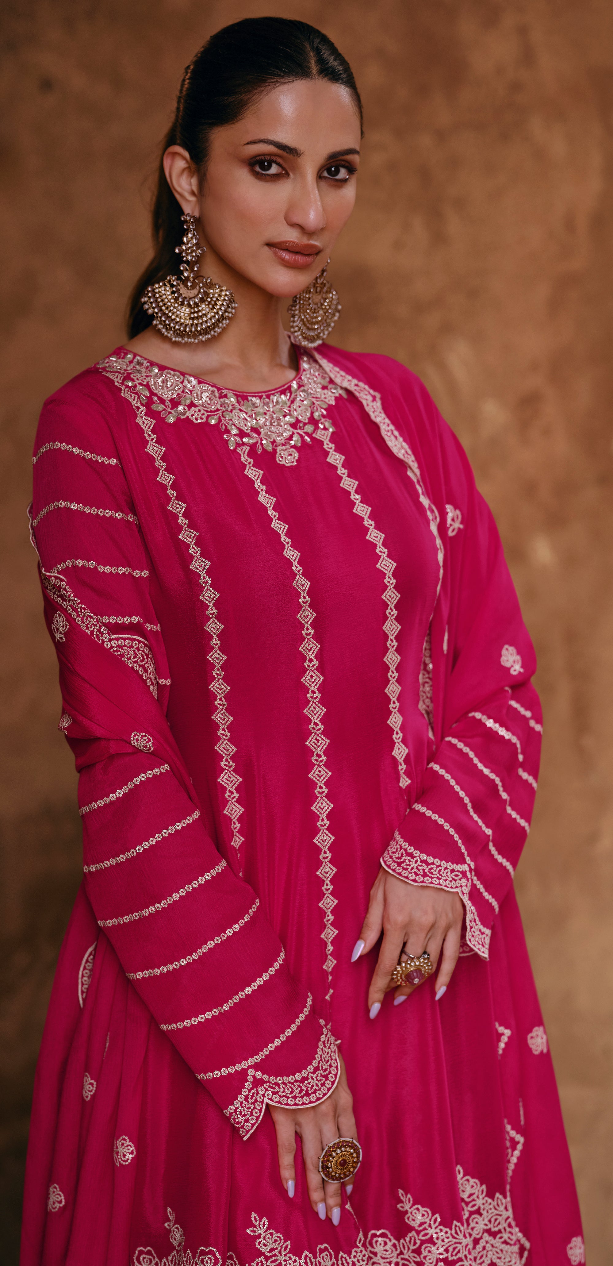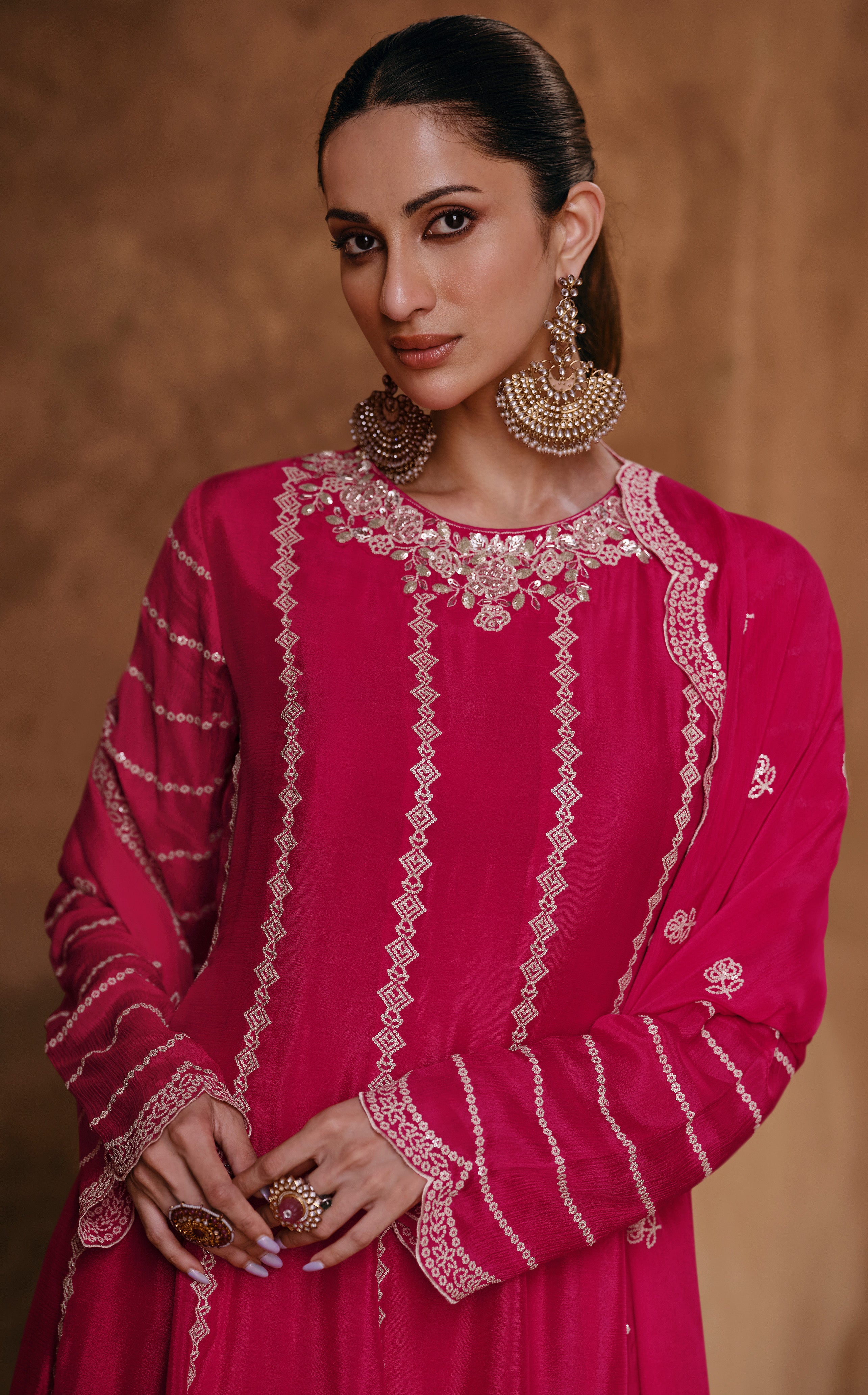 Unique Designer Pure Chinon Dark Pink Dress with detailed embroidery Sharara