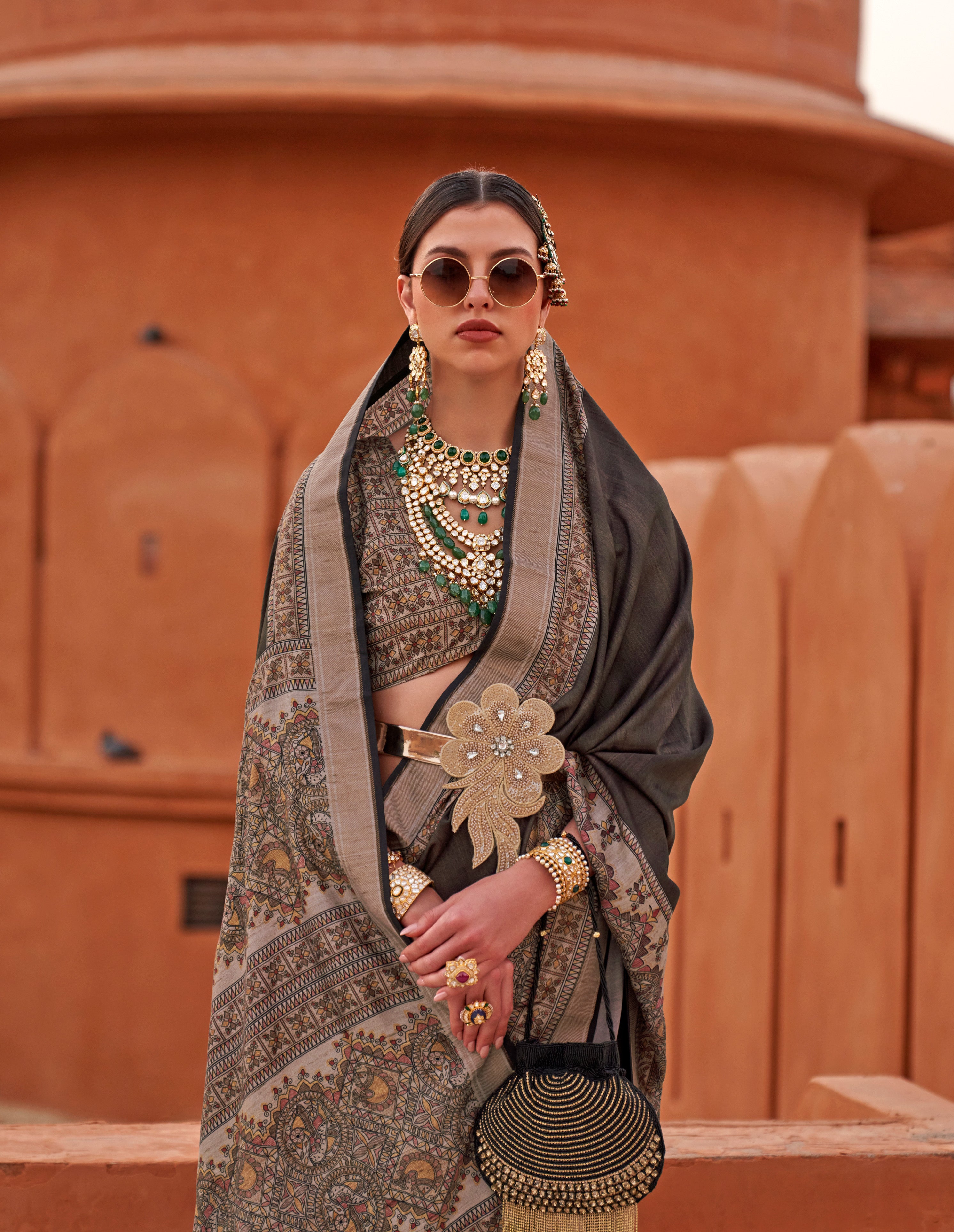 Weaved Brown Black Shaded Ajrak Inspired silk saree with gold finish | Silk saree