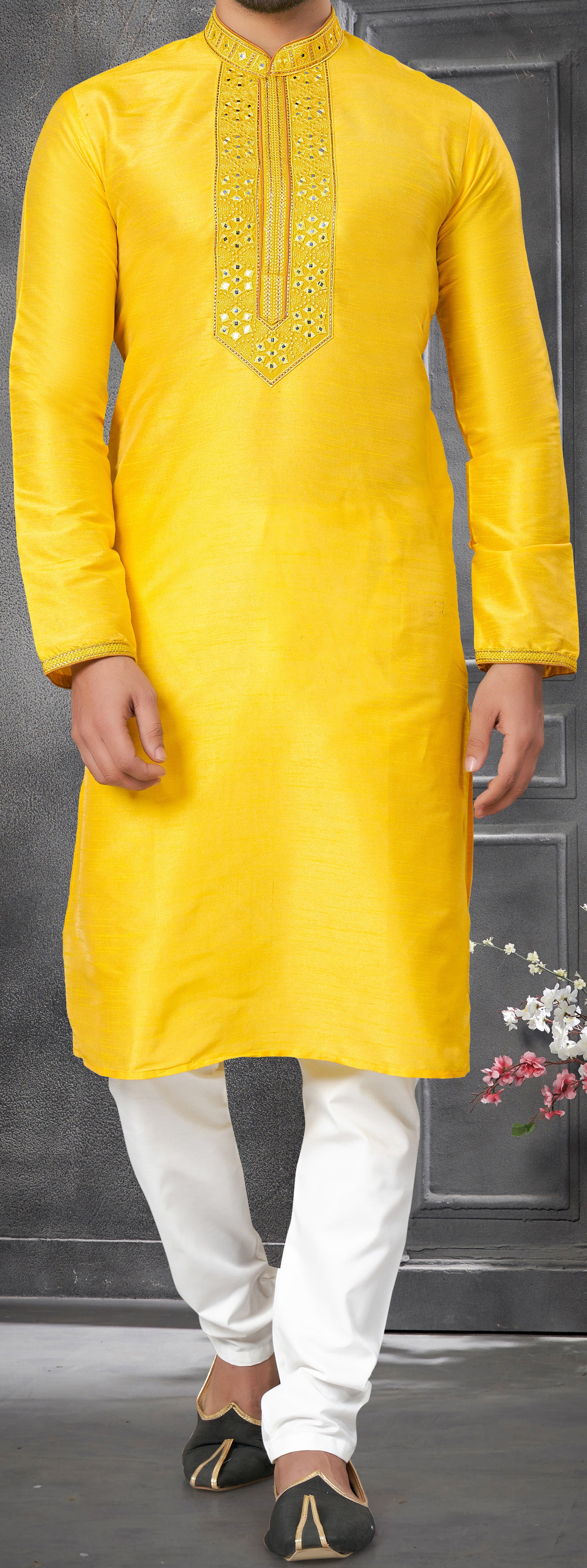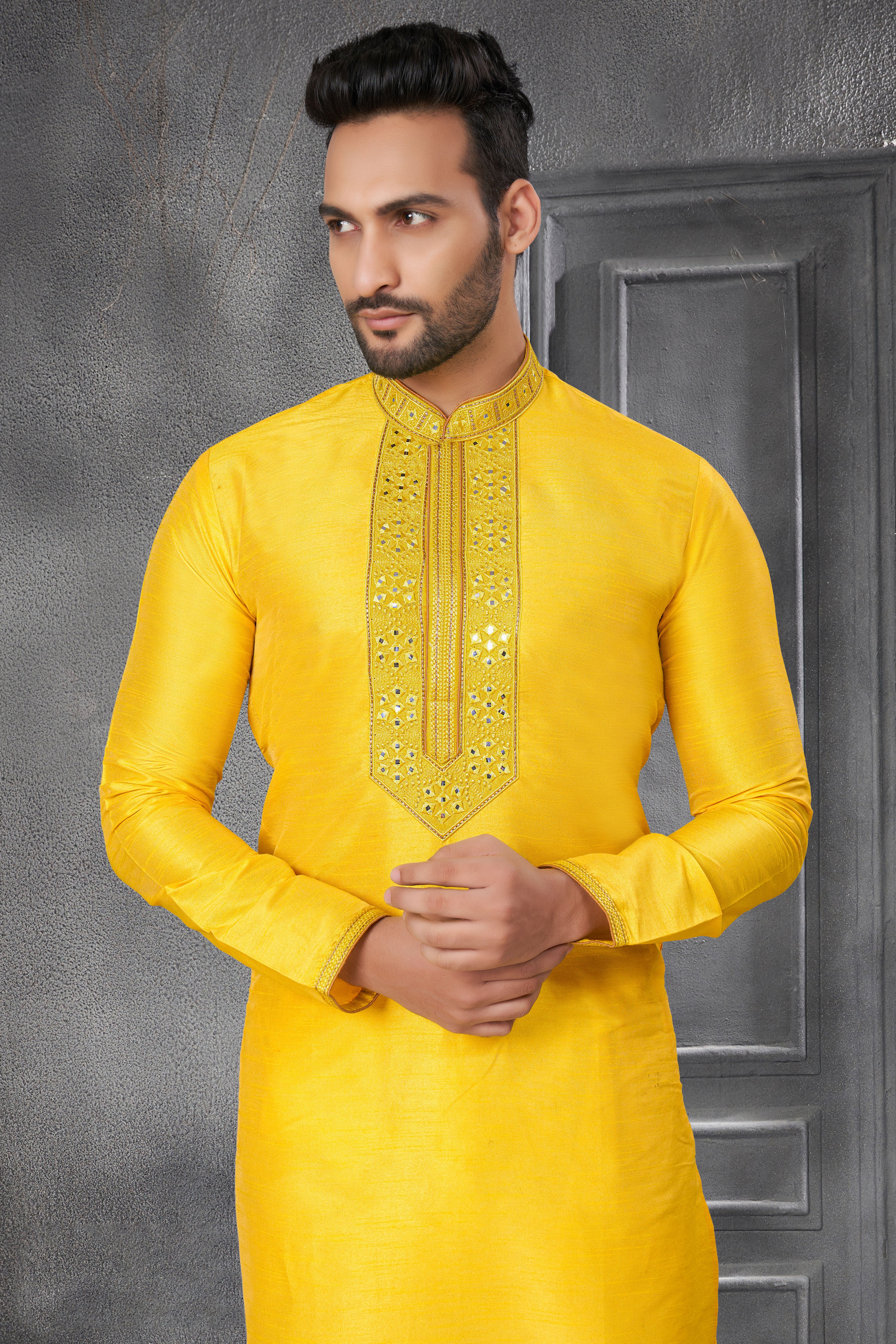 Yellow Traditional Designer Silk Kurta with Mirror Work for all occasion | kurta pajama