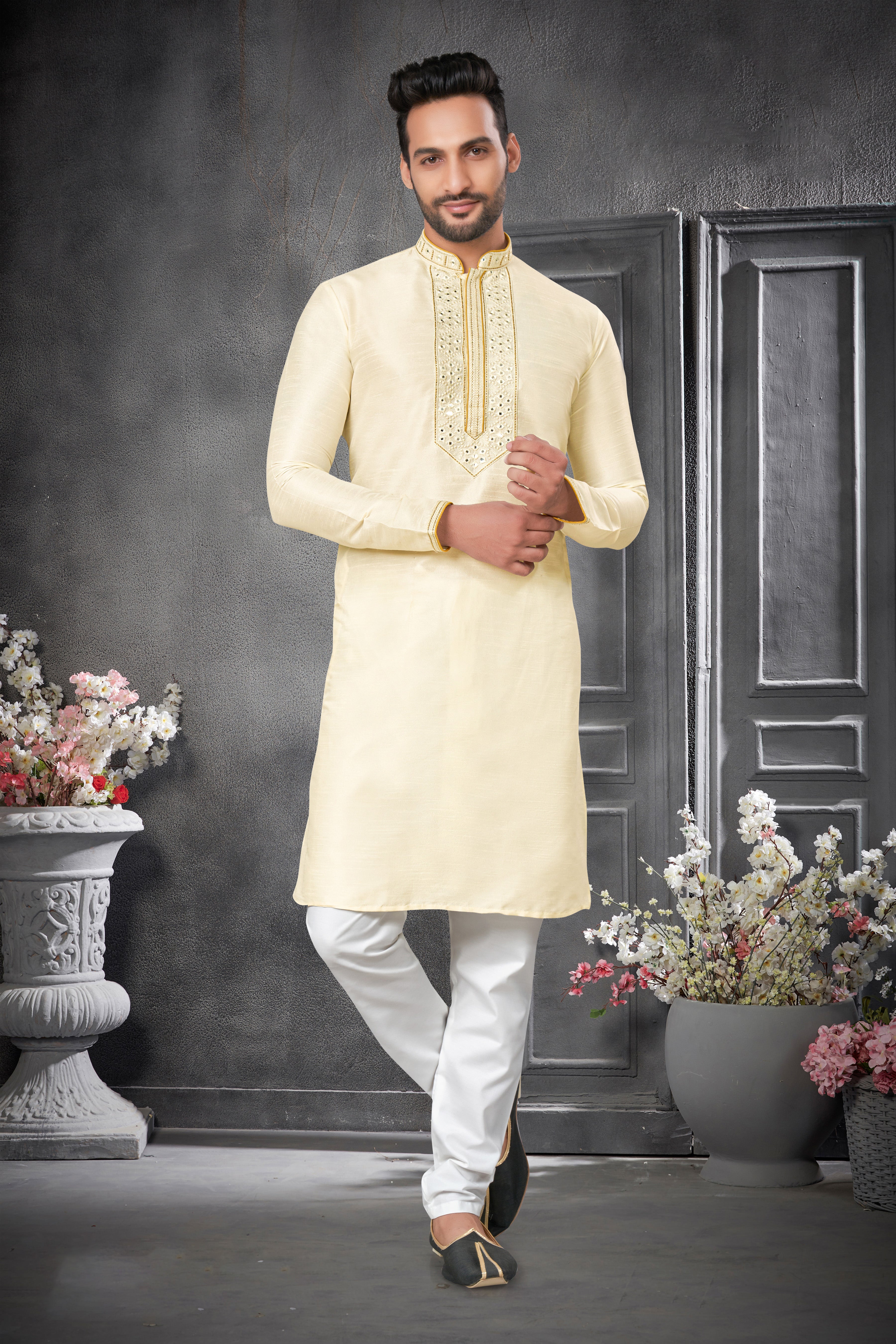 Cream Traditional Designer Silk Kurta with Mirror Work for all occasion | kurta pajama